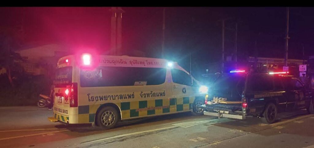 เมื่อเวลา 23.55 น.วันที่ 9 สิงหาคม 2568 ศูนย์นเรนทรแพร่ (สายด่วน1669)อบจ.แพร่ แจ้งให้ศูนย์กู้ชีพเวียงโกศัย และสมาคมอาสาสมัครกู้ภัยจังหวัดแพร่ ให้ออกตรวจสอบ อุบัติเหตุที่แยกร่องฟอง ตำบลร่องฟอง อำเภอเมืองแพร่ จังหวัดแพร่ มีรถกระบะชนกับรถ จยย. มีผู้ได้รับบาดเจ็บ