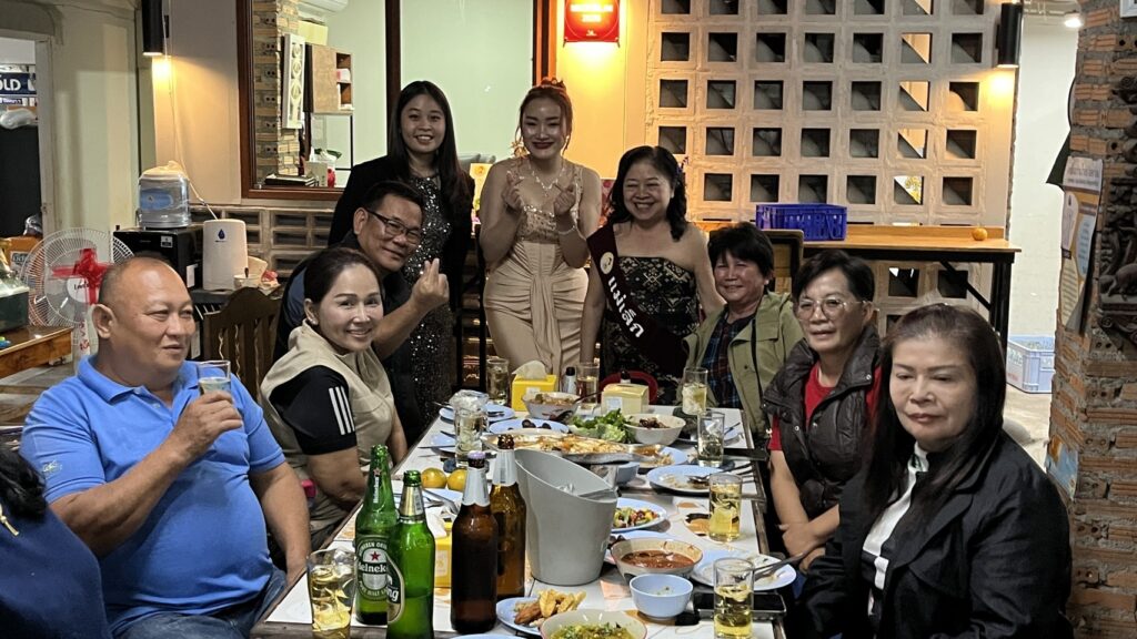 บรรยากาศเป็นไปด้วยความสนุกสนาน เพราะทุกคนได้นั่งโต๊ะรวมกัน เพื่อรับประทานอาหารและเครื่องดื่ม สลับกับการจับฉลากรางวัลที่ทุกคนซื้อมาในราคาเริ่มต้นที่ 200 บาท มีเครื่องใช้ไฟฟ้าและเงินสดเป็นรางวัลก็มีมามอบให้กันในงาน