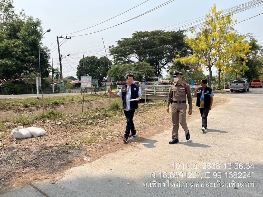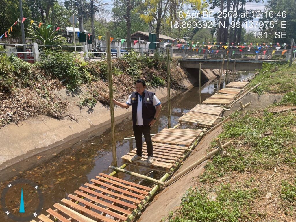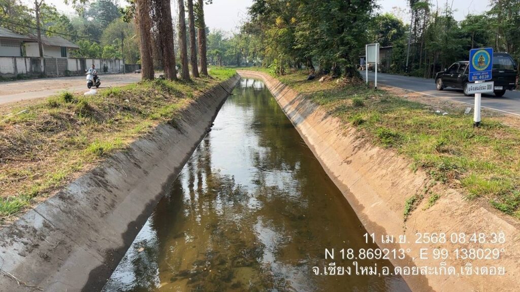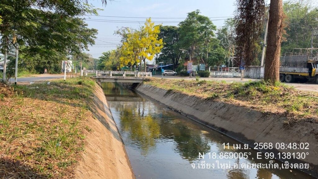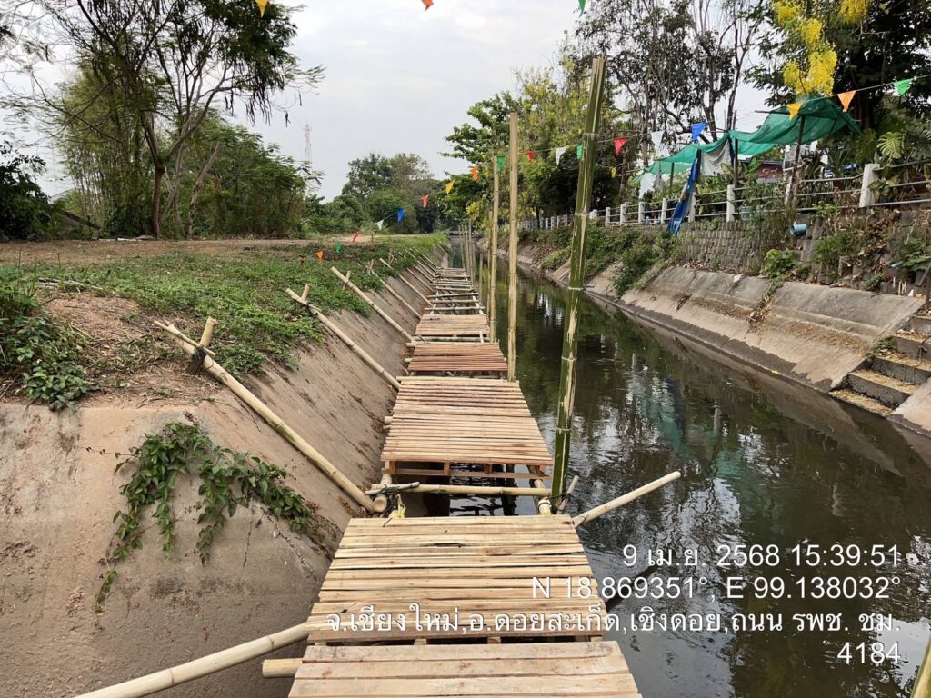 วันที่ 11 เมษายน 2568 โครงการส่งน้ำและบำรุงรักษาแม่กวงอุดมธารา รายงานว่า โครงการฯ ได้ให้เจ้าหน้าที่ลงพื้นที่ติดตามผลการส่งน้ำตามรอบเวรการส่งน้ำ รอบที่ 8 ในพื้นที่ฝ่ายส่งน้ำฯ ที่ 1 – 4 ซึ่งการตรวจ พบว่า มีการทำสิ่งปลูกสร้างในบริเวณคลองส่งน้ำสายใหญ่ผาแตก ทางโครงการฯ ได้มอบหมายให้ นายทวีศักดิ์ ภิรมย์ หัวหน้าฝ่ายส่งน้ำและบำรุงรักษาที่ 2 ลงพื้นที่ตรวจสอบข้อเท็จจริง พบว่า บริเวณ กม. 6+995 พื้นที่ตำบลดอยสะเก็ด อำเภอดอยสะเก็ด จังหวัดเชียงใหม่ หลังที่ว่าการอำเภอดอยสะเก็ด ได้มีการทำที่นั่งไม้ไผ่ลงไปในบริเวณคลองส่งน้ำสายใหญ่ผาแตก เป็นแนวยาวตามคลองส่งน้ำ