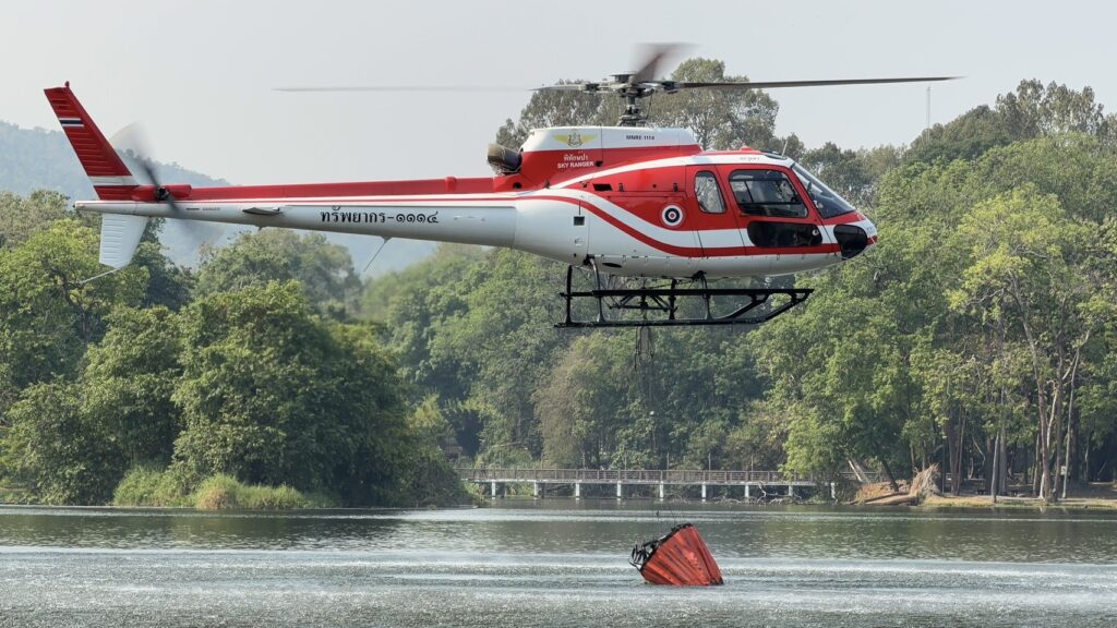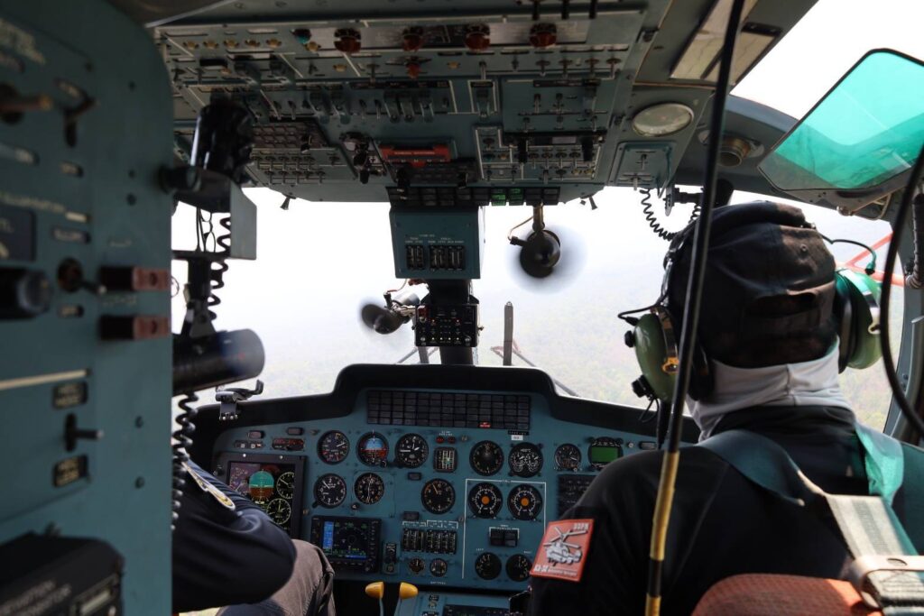 พร้อมกันนี้ ได้สนับสนุนภาคอากาศ โดยส่งเฮลิคอปเตอร์ของกระทรวงทรัพยากรธรรมชาติและสิ่งแวดล้อม บินโปรยน้ำลดความรุนแรงของไฟในพื้นที่สูง เพื่อควบคุมเพลิงให้อยู่ในวงจำกัดในช่วงเช้า ก่อนที่ในช่วงบ่ายจะส่งเฮลิคอปเตอร์รุ่น เคเอ 32 ของกรมป้องกันและบรรเทาสาธารณภัย เข้าร่วมปฏิบัติการโปรยน้ำดับไฟเพิ่มเติม เพื่อเสริมกำลังและป้องกันไม่ให้ไฟป่าลุกลามเข้าสู่พื้นที่สำคัญของจังหวัด