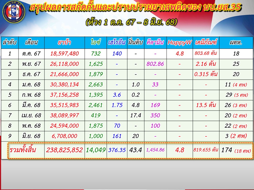 ปัจจุบัน นบ.ยส.35 มีผลการดำเนินงาน ตั้งแต่ 1 ต.ค. 67 – 8 มิ.ย. 68 มีเหตุการณ์สำคัญ 165 ครั้ง เหตุการณ์ (ปะทะ 35 ครั้ง ตรวจยึด/จับกุม 129 ครั้ง) จับกุมยาบ้า 238 ล้านเม็ดเศษ, ไอซ์ 14,049 กก., เฮโรอีน 376 กก., คีตามีน 1454 กก., Happy Water 4.8 กก., เคมีภัณฑ์ 819 ตัน ผู้ต้องหา 174 คน เสียชีวิต 18 ศพ