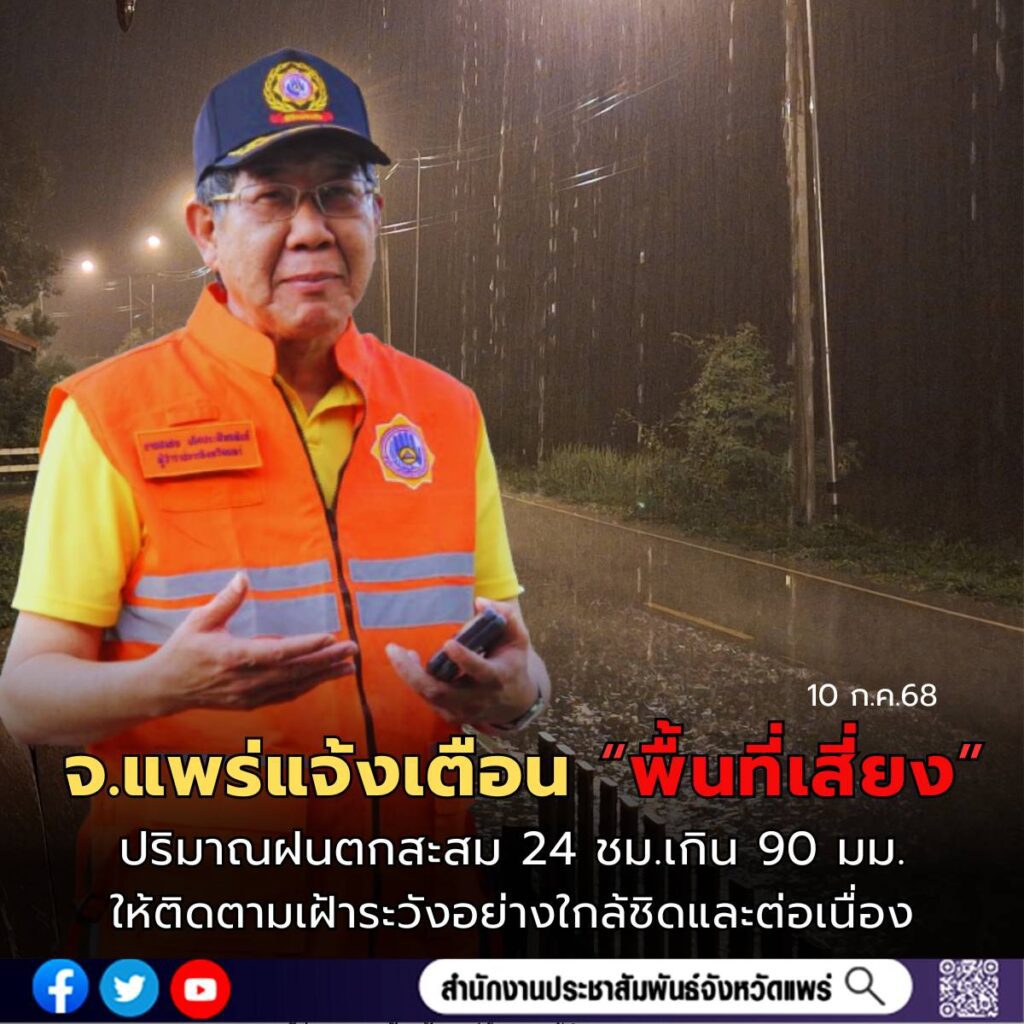นายสมชัย เลิศประสิทธิพันธ์ ผู้ว่าราชการจังหวัดแพร่ ในฐานะผู้อำนวยการกองอำนวยการป้องกันและบรรเทาสาธารณภัยจังหวัดแพร่ ขอให้ประชาชนระวังอันตรายจากฝนตกหนักถึงหนักมากและฝนที่ตกสะสม ซึ่งอาจทำให้เกิดน้ำท่วมฉับพลันและน้ำป่าไหลหลาก โดยเฉพาะพื้นที่ลาดเชิงเขาใกล้ทางน้ำไหลผ่านและพื้นที่ลุ่ม ให้เตรียมความพร้อมรับสถานการณ์ดังกล่าว