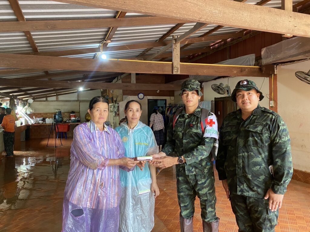 มอบยาทาภายนอกรักษาอาการคัน/เชื้อรา และมอบยาสามัญประจำบ้าน พร้อมให้คำแนะนำการการใช้ยา การดูแลตนเองเพื่อป้องกันโรคที่มากับน้ำท่วม และพูดคุยให้กำลังใจแก่ประชาชนผู้ประสบอุทกภัย ณ บ้านน้ำมวบ ต.น้ำมวบ อ.เวียงสา จ.น่าน