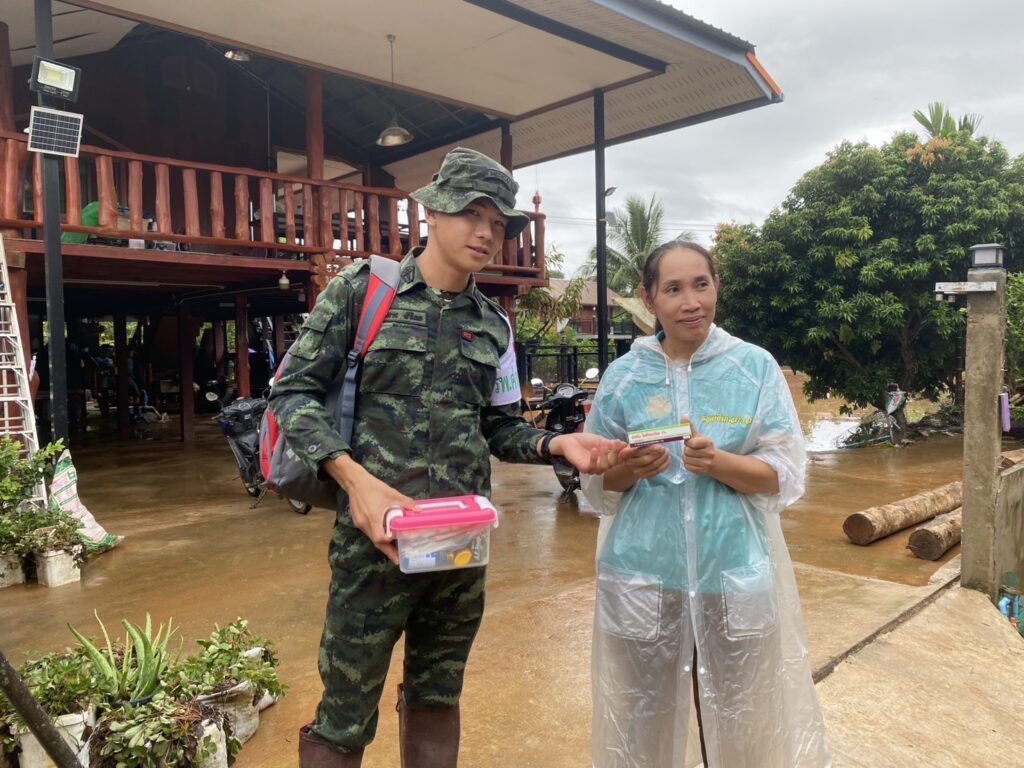 มอบยาทาภายนอกรักษาอาการคัน/เชื้อรา และมอบยาสามัญประจำบ้าน พร้อมให้คำแนะนำการการใช้ยา การดูแลตนเองเพื่อป้องกันโรคที่มากับน้ำท่วม และพูดคุยให้กำลังใจแก่ประชาชนผู้ประสบอุทกภัย ณ บ้านน้ำมวบ ต.น้ำมวบ อ.เวียงสา จ.น่าน