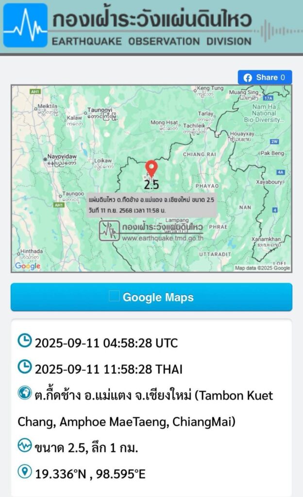 วันนี้ 11 กย. 68 นายอัธยา อรรณพเพ็ชร ผู้อำนวยการโครงการส่งน้ำและบำรุงรักษาแม่แฝก-แม่งัดสมบูรณ์ชล เปิดเผยว่า เมื่อเวลา 11.58 น. เกิดแผ่นดินไหว บริเวณบ้านกี๊ดช้าง อ.แม่แตง จ.เชียงใหม่ วัดขนาดได้ 2.5 ลึก 1 กม. โครงการฯ ได้สั่งการเจ้าหน้าที่เขื่อนแม่งัดฯ ตรวจสอบสภาพเขื่อน อาคาร service spillway ตลอดจนอาคารประกอบต่างๆ