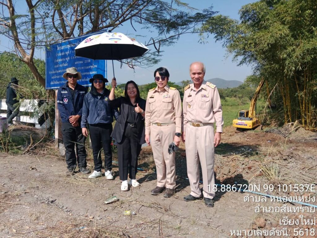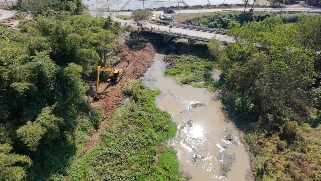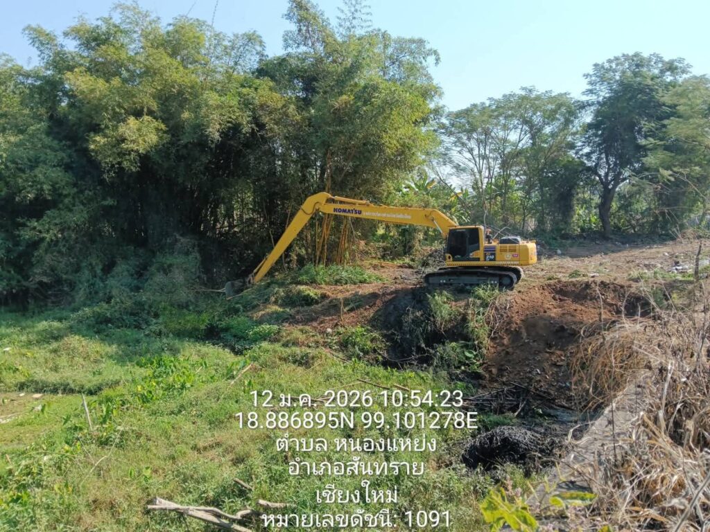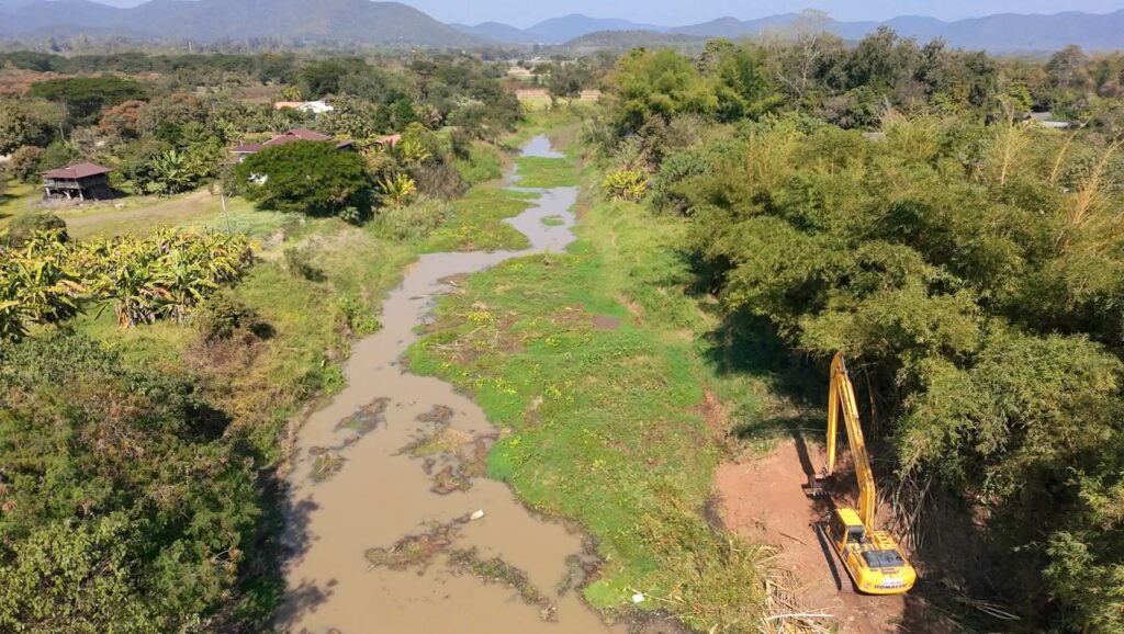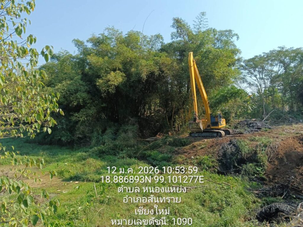 เชียงใหม่-โครงการส่งน้ำและบำรุงรักษาแม่กวงอุดมธารา ลงพื้นที่ร่วมกับองค์การบริหารส่วนจังหวัดเชียงใหม่ และเทศบาลตำบลหนองแหย่ง ดำเนินการขุดลอกคลองและกำจัดวัชพืชในลำน้ำกวง บริเวณสะพานข้ามลำน้ำกวง กม.4+500 ถึง กม.6+000 บ้านร้อง หมู่ที่ 2 ตำบลหนองแหย่ง อำเภอสันทราย จังหวัดเชียงใหม่