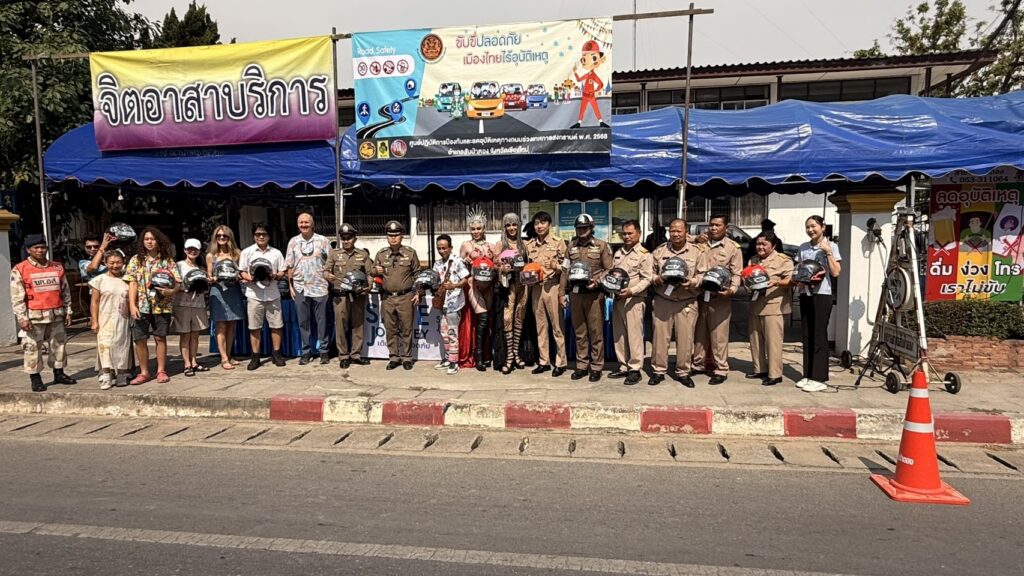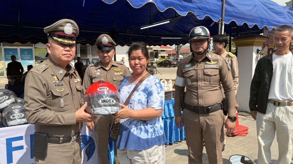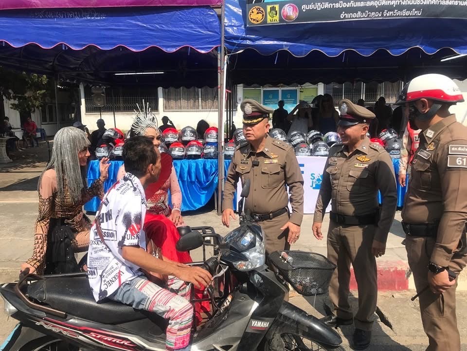 เชียงใหม่-สภ.สันป่าตอง เชียงใหม่ ตั้งด่านตรวจจับผู้ไม่สวมใส่หมวกนิรภัย หลังจากออกใบเสร็จ แจกหมวกกันน็อคฟรี