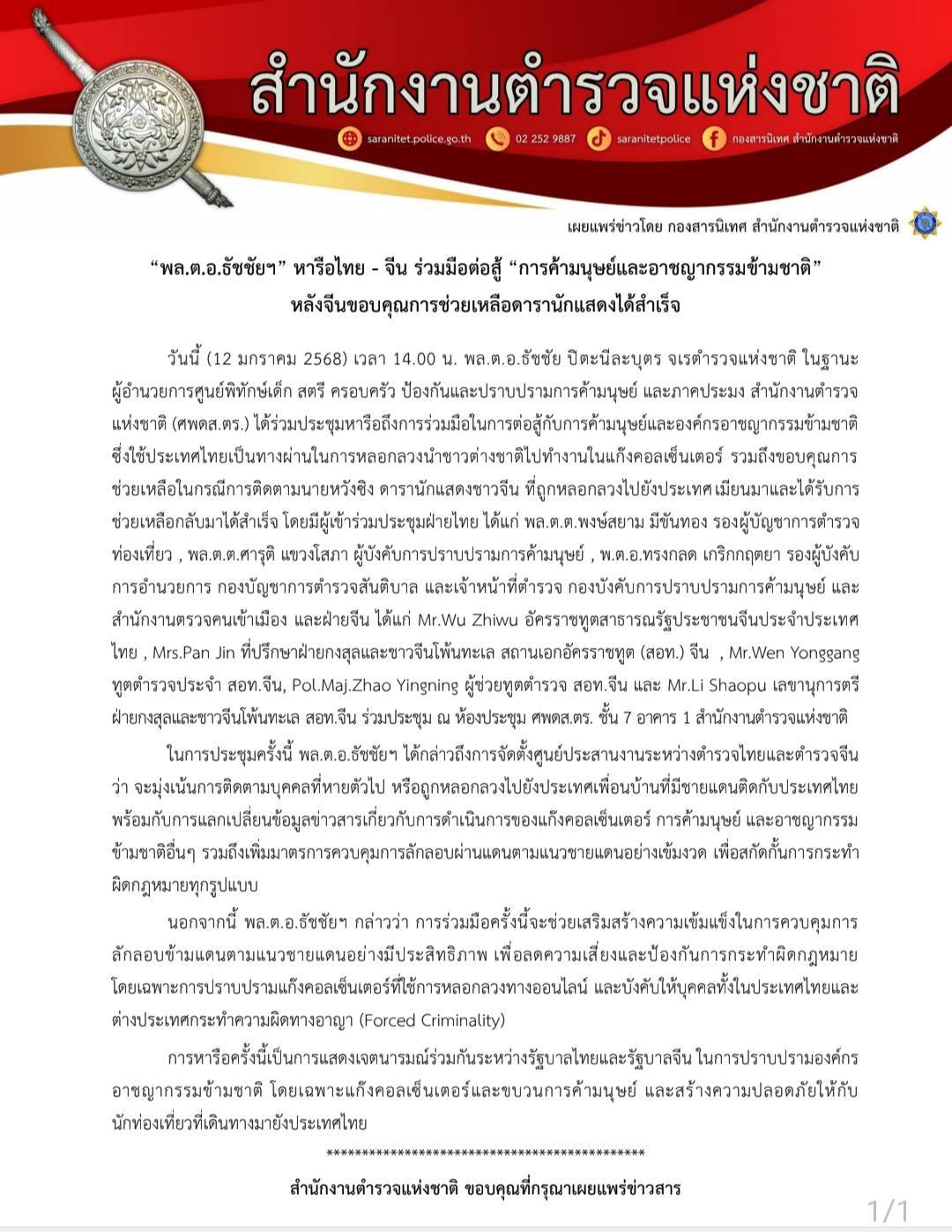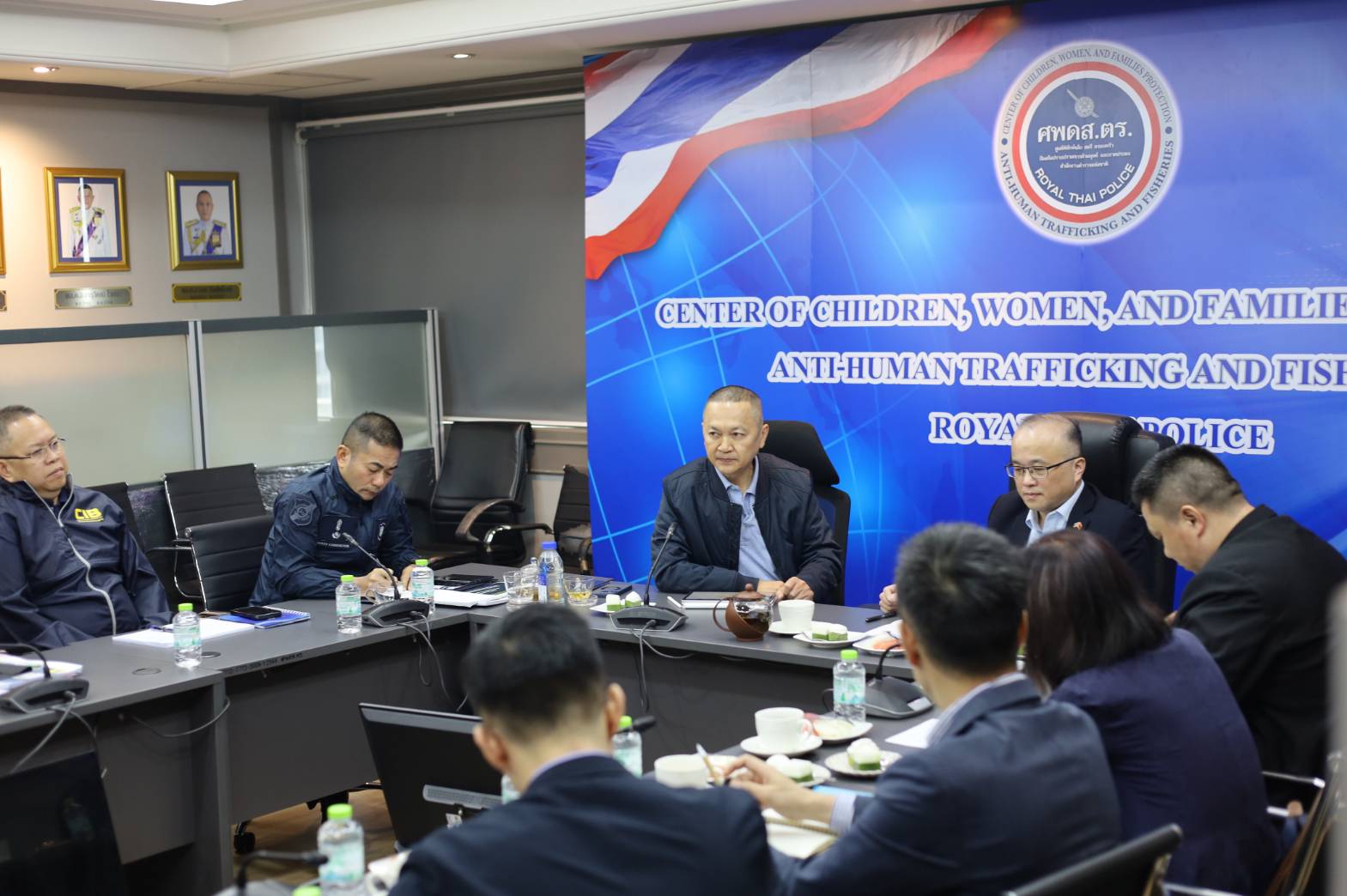 Today (January 12, 2025) at 2:00 PM in the meeting room of the Anti-Human Trafficking Operations Center, Pol.Gen. Thatchai Pitaneelaboot, Senior Inspector General and Director of the Anti-Human Trafficking Operations Center, participated in a discussion on collaboration to combat human trafficking and transnational criminal organizations that exploit Thailand as a transit point to deceive foreigners into working in call center gangs. This also included thanking efforts to assist the Chinese actor Mr. Wang Xing, who was deceived and taken to Myanmar but was successfully rescued. Participants from the Thai side included Pol. Maj. Gen. Phongsiam Meekhanthong, Deputy Commissioner of the Tourist Police, Pol. Maj. Gen. Saruti Kaengsopha, Commander of the Anti-Human Trafficking Division, Pol. Col. Songkrod Kerikratya, Deputy Commander of the Special Branch Royal Thai Police, along with officers from the Anti-Human Trafficking Division and the Immigration Bureau.