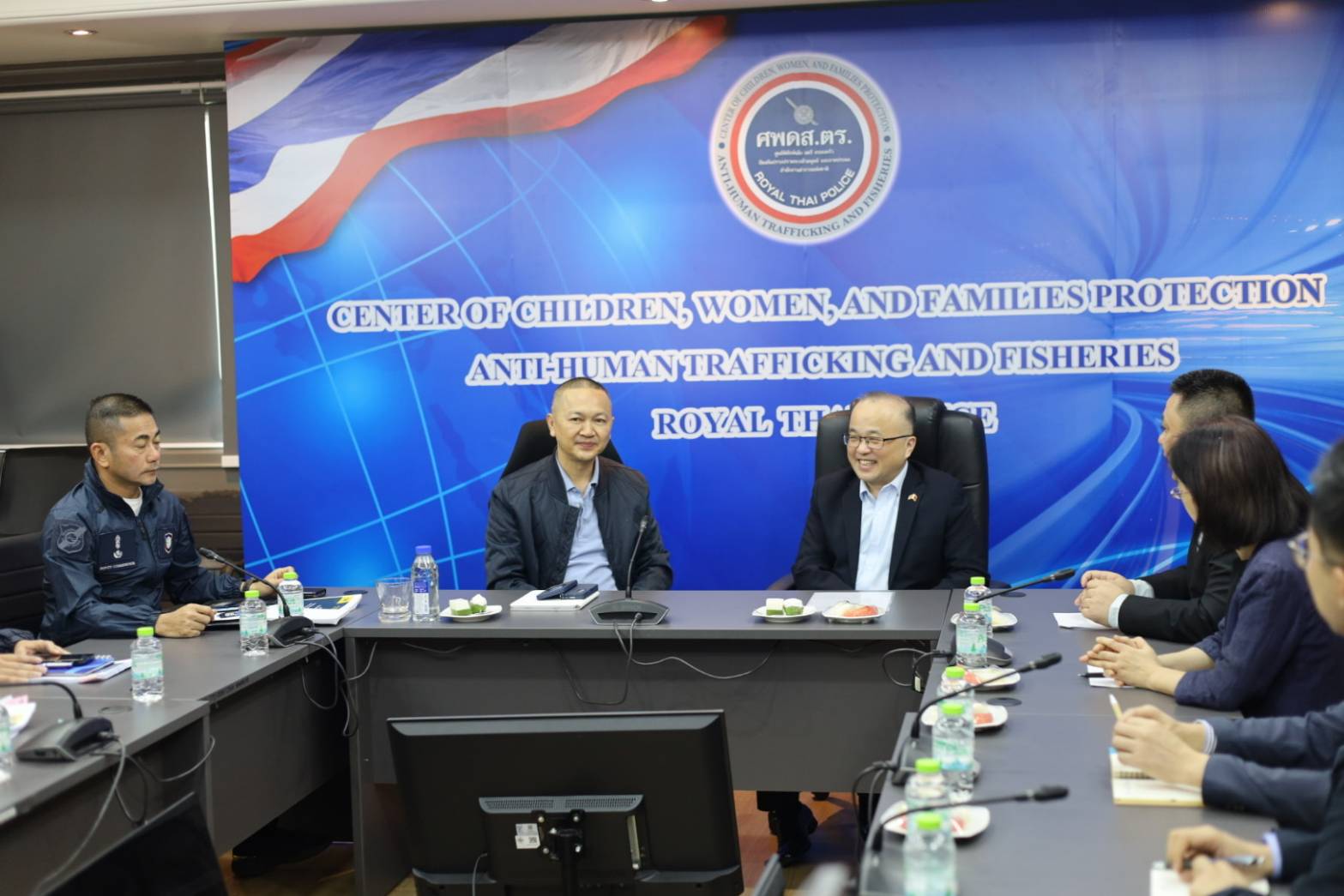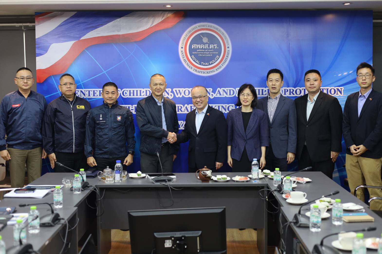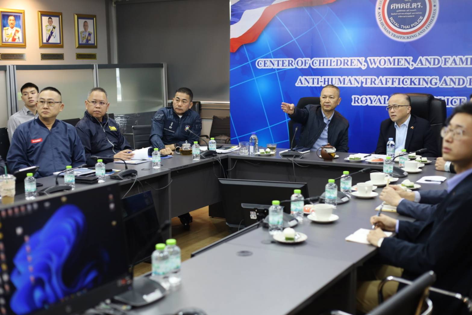 Today (January 12, 2025) at 2:00 PM in the meeting room of the Anti-Human Trafficking Operations Center, Pol.Gen. Thatchai Pitaneelaboot, Senior Inspector General and Director of the Anti-Human Trafficking Operations Center, participated in a discussion on collaboration to combat human trafficking and transnational criminal organizations that exploit Thailand as a transit point to deceive foreigners into working in call center gangs. This also included thanking efforts to assist the Chinese actor Mr. Wang Xing, who was deceived and taken to Myanmar but was successfully rescued. Participants from the Thai side included Pol. Maj. Gen. Phongsiam Meekhanthong, Deputy Commissioner of the Tourist Police, Pol. Maj. Gen. Saruti Kaengsopha, Commander of the Anti-Human Trafficking Division, Pol. Col. Songkrod Kerikratya, Deputy Commander of the Special Branch Royal Thai Police, along with officers from the Anti-Human Trafficking Division and the Immigration Bureau.