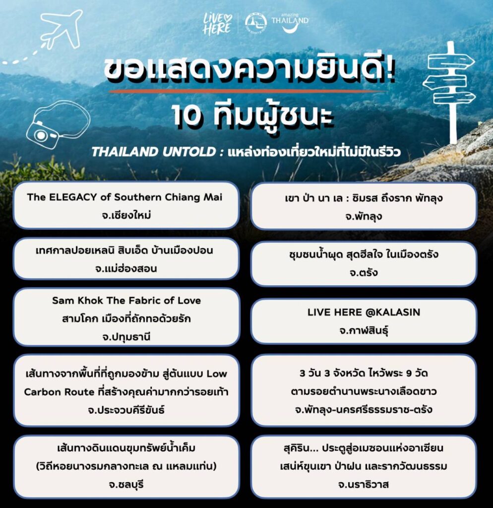 โดยกิจกรรมประกวดออกแบบเส้นทาง “THAILAND UNTOLD แหล่งท่องเที่ยวใหม่ที่ไม่มีในรีวิว” จากหลายเรื่องเล่าที่เต็มไปด้วยหัวใจ สู่ 10 เส้นทางใหม่ที่พร้อมพาคุณไปรู้จัก “ประเทศไทยที่ยังไม่ถูกเล่า” โดยการท่องเที่ยวแห่งประเทศไทย (ททท.) จัดโครงการ Live Here ภายใต้ยุทธศาสตร์ THE NEW THAILAND เพื่อค้นหา พัฒนาแหล่งท่องเที่ยวใหม่ที่ยังไม่เป็นที่รู้จักและเรื่องราวท้องถิ่นที่ยังไม่เคยถูกเล่า นำมาต่อยอดเป็นเส้นทางท่องเที่ยวเชิงประสบการณ์ที่มีคุณค่าและความหมาย ดำเนินการผ่านการจัดกิจกรรมในรูปแบบแคมเปญการประกวด ภายใต้แนวคิด “Stay a little longer, Live a little deeper” อยู่ต่ออีกนิด… ใช้ชีวิตให้ลึกซึ้งกว่าเดิม” เพื่อค้นหาพื้นที่หรือเรื่องราวที่ไม่มีในรีวิว พร้อมพัฒนาต่อยอดให้เป็นจุดหมายปลายทางที่โดดเด่น กระตุ้นให้เกิดการเดินทาง และกระจายรายได้สู่ท้องถิ่น โดยเส้นทางท่องเที่ยวนี้เป็นการขับเคลื่อนและยกระดับแหล่งท่องเที่ยว กิจกรรมการท่องเที่ยว คุณภาพการบริการ สิ่งอำนวยความสะดวก บุคลากรความยั่งยืนของการท่องเที่ยวของ 4 อำเภอตอนใต้ของเชียงใหม่ ได้แก่ สันป่าตอง-จอมทอง-ฮอด-ดอยเต่า เป็นการสร้างสรรค์และต่อยอดการวิจัยเชิงพาณิชย์โครงการการพัฒนาเมืองสร้างสรรค์พื้นที่ภาคเหนือ สู่การเป็นศูนย์กลางเมืองสร้างสรรค์ด้านหัตถกรรมและศิลปะพื้นบ้าน