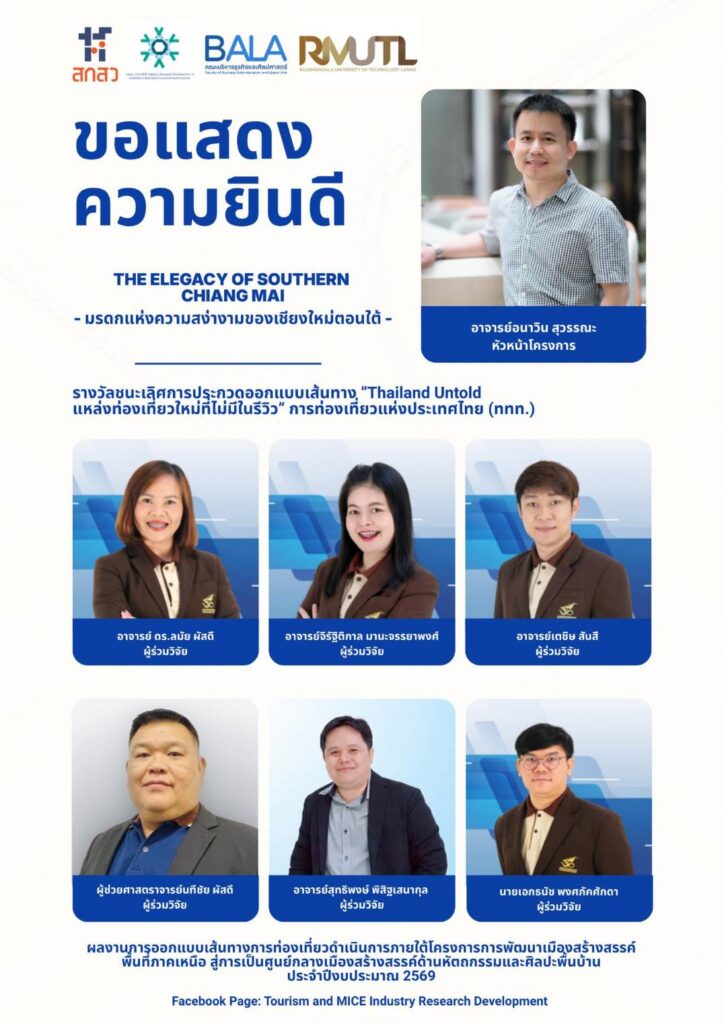 อาจารย์อนาวิน สุวรรณะ พร้อมคณะนักวิจัย มหาวิทยาลัยเทคโนโลยีราชมงคลล้านนา คว้ารางวัล 1 ใน 10 จากผลงานการออกแบบเส้นทางการท่องเที่ยวจากการท่องเที่ยวแห่งประเทศไทย (ททท.) “The ELEGACY of Southern Chiang Mai – มรดกแห่งความสง่างามของเชียงใหม่ตอนใต้”