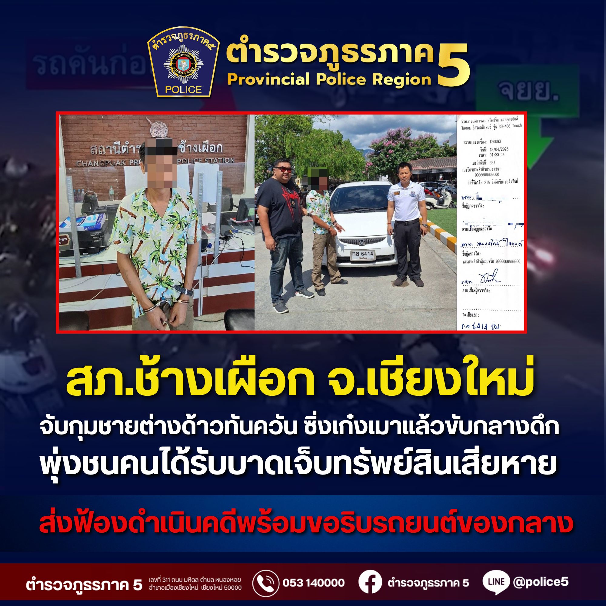 เชียงใหม่-ตำรวจข้างเผือก จ.เชียงใหม่ จับกุมชายต่างด้าวซิ่งเก๋งเมาแล้วขับกลางดึก พุ่งชนคนได้รับบาดเจ็บทรัพย์สินเสียหาย ส่งฟ้องดำเนินคดีพร้อมริบรถยนต์ของกลาง