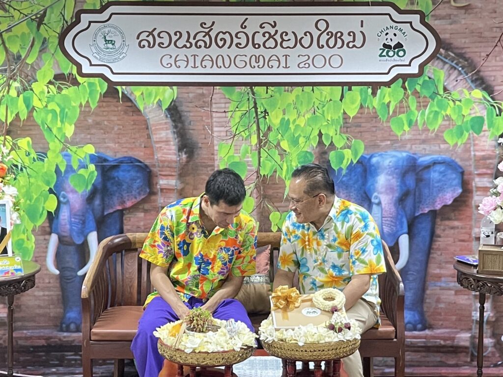 ซึ่งเดินทางมาตรวจเยี่ยมการดำเนินงานสวนสัตว์เชียงใหม่ และในโอกาสนี้ ผู้อำนวยการสวนสัตว์ฯ ได้ถือโอกาสเนื่องเทศกาลวันสงกรานต์ นำพนักงานและลูกจ้างสวนสัตว์เชียงใหม่ เข้ารดน้ำดำหัวขอพร ตามประเพณีสืบสานกันมายาวนาน เพื่อแสดงความเคารพ ขอบคุณ และขอพรจากผู้ใหญ่ โดยนำน้ำขมิ้นส้มป่อย พวงมาลัยดอกมะลิ และขอคำอวยพร ถือเป็นการเริ่มต้นปีใหม่ไทยอย่างอบอุ่น เสริมสร้างความสุขความสามัคคีและสร้างขวัญกำลังใจแก่บุคลากร และความเป็นสิริมงคลตลอดปี