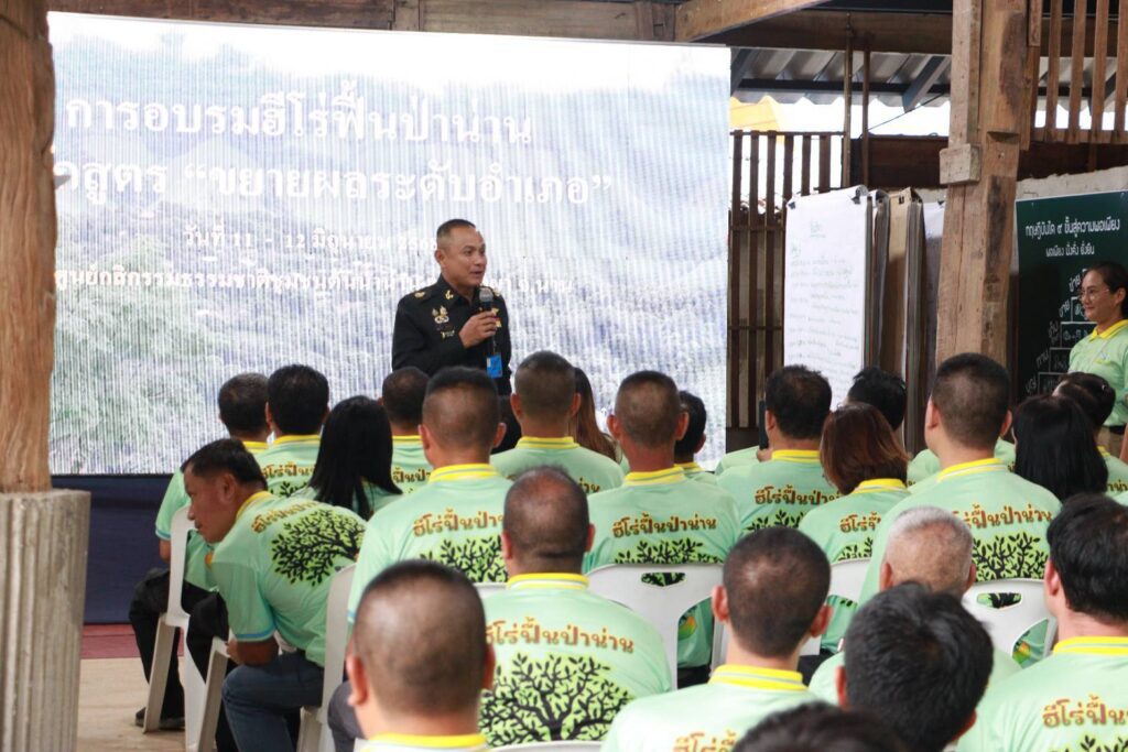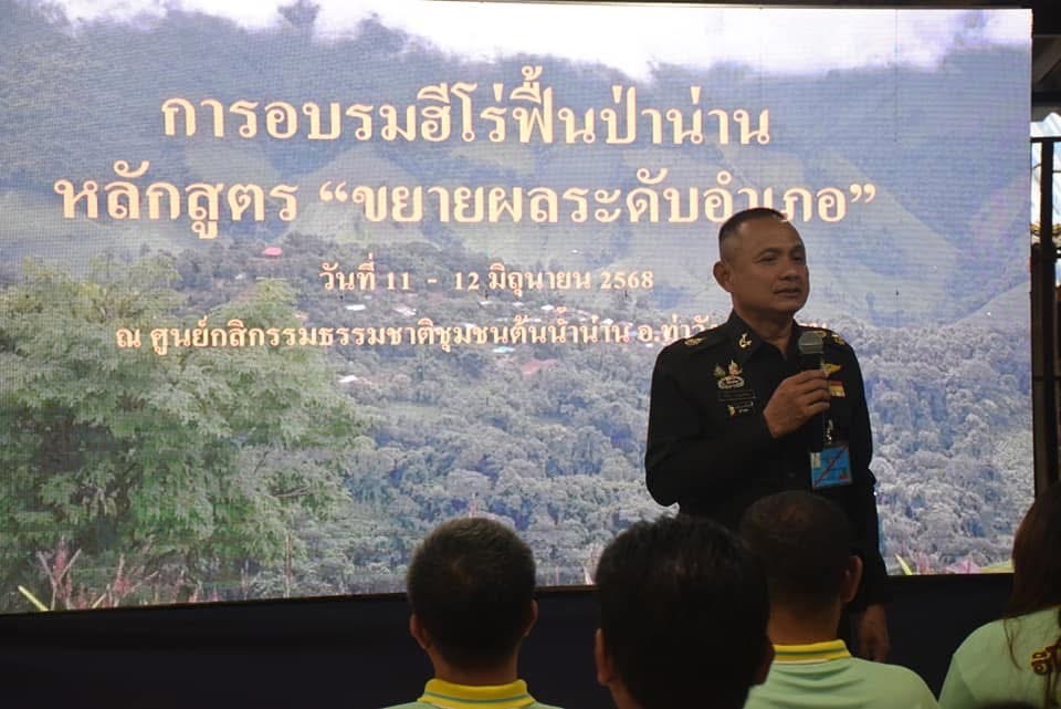 เมื่อวันที่ 12 มิถุนายน 2568 พลตรี ชายแดน กฤษณสุวรรณ รองแม่ทัพภาคที่ 3/ รองผู้อำนวยการศูนย์อำนวยการจิตอาสาพระราชทานภาค 3 และคณะฝ่ายอำนวยการศูนย์อำนวยการจิตอาสาพระราชทานภาค 3 เดินทางมาตรวจเยี่ยมการอบรมปฐมนิเทศวิทยากร “โครงการ ฮีโร่ ฟื้นป่าน่าน” ภายใต้โครงการปลูกป่า 3 อย่าง ประโยชน์ 4 อย่าง 1 ล้านไร่ เพื่อฟื้นฟูป่าต้น น้ำน่าน ตามพระราชปณิธานพระบาทสมเด็จพระเจ้าอยู่หัว มีวัตถุประสงค์เพื่อให้ผู้เข้ารับการอบรมฯ เข้าใจวัตถุประสงค์ กระบวนการ เป้าหมาย วิธีการดำเนินการของโครงการฯ เป็นไปในทิศทางเดียว สามารถนำไปสู่เป้าหมายการฟื้นฟูป่า โดยน้อมนำแนวทางพระราชดำริปรัชญาของเศรษฐกิจพอเพียงและทฤษฎีใหม่ ไปสู่การปฏิบัติ การบริหารจัดการดิน น้ำ ป่า ได้ รวมทั้งในการออกแบบพื้นที่ หลักการเสริมสร้างด้วยหลักกสิกรรมธรรมชาติ ป่า 3 อย่างได้ประโยชน์ 4 อย่าง สร้างความยั่งยืนด้วยอารยธรรม ภูมิปัญญาท้องถิ่น และอยู่รอดปลอดภัยเมื่อมีภัยพิบัติ ซึ่งจัดขึ้นระหว่างวันที่ 11-12 มิถุนายน 2568 ณ ศูนย์กสิกรรมธรรมชาติชุมชนต้นน้ำน่าน โดยมี ผู้ร่วมอบรมของทีมระดับอำเภอ แบ่งเป็น 4 โซน จำนวน 142 คน และจะนำไปขยายผลในทีมระดับตำบล ในห้วงเดือน กรกฎาคม 2568 ต่อไป