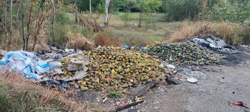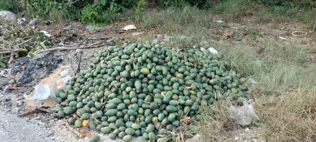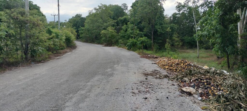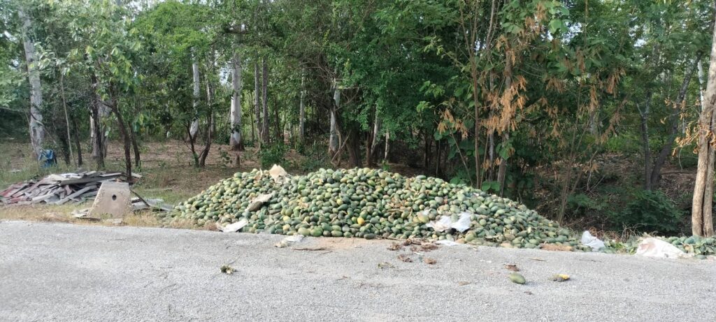 ผู้สื่อข่าว เดินทางเข้าไปถนนเส้นหนึ่งก่อนจะขึ้นเนินตรงข้ามเส้นทางจะไปปากทางบ้านเหล่ายาว อยู่ซ้ายมือเยื้องๆกับ องค์การบริหารส่วนตำบลเหล่ายาว อำเภอบ้านโฮ่ง จังหวัดลำพูน จะมีแยกถนนอยู่ซ้ายมือ ชาวบ้านเรียกว่า (ทางเข้าไร่รุ่งศักดิ์) ห่างจากถนนใหญ่ประมาณ 200-300 เมตรข้างซ้ายและขวา เหลือบไปเห็นลูกมะม่วงกองใหญ่หลายกองซ้ายขวา ซึ่งอาจจะเป็นเจ้าของสวนหรือชาวบ้านนำมาทิ้งไว้ แต่ทำไมไม่เอาไปทิ้งให้มันถูกที่หรือที่ ที่เขาทิ้งได้หรือเข้าไปข้างในให้ไกลถนนหนทางคนผ่านสัญจรจะดูดีกว่าไหมครับแต่แบบนี้ทำรายระบบนิเวศและสกปรกเป็นเส้นทางหลักที่คนใช้เข้าสวนสันจรไปมา