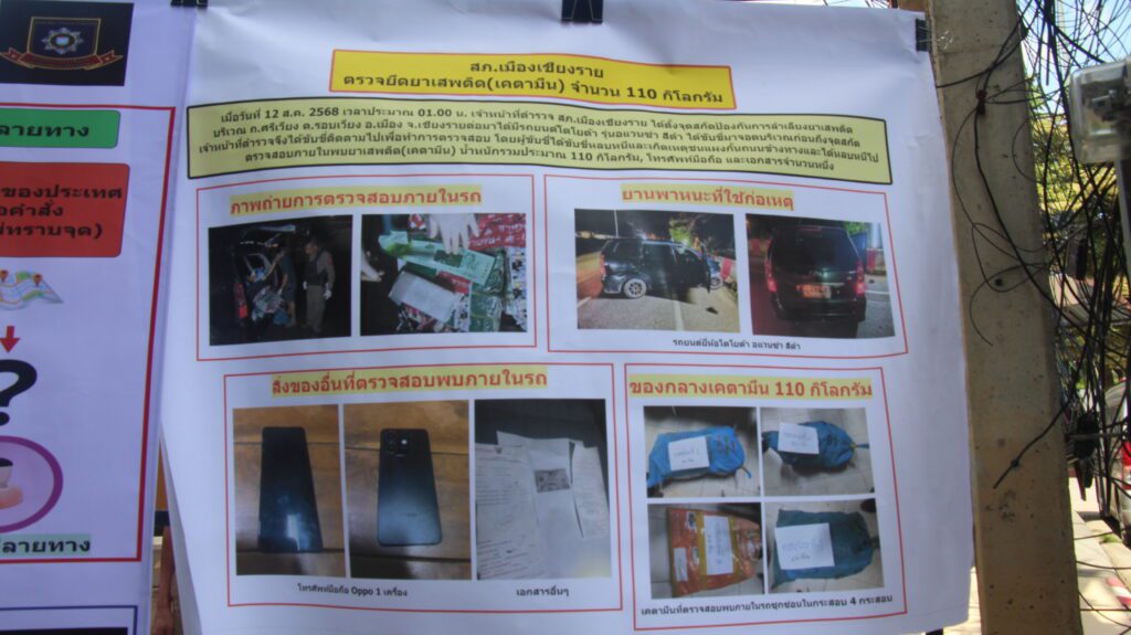 คดีที่ 5 เมื่อวันที่ 12 ส.ค.2568 เวลาประมาณ 21.00 น. เจ้าหน้าที่ตำรวจชุดจับกุมได้ปฏิบัติหน้าที่ตั้งจุดตรวจด่านแก่งปันเต๊าฯ ได้รับแจ้งเหตุเมาสุราอาละวาด บ้านห้วยโจ้ ม.4 ต.แม่นะ อ.เชียงดาว จ.เชียงใหม่ เมื่อทราบดังนั้นจึงได้ออกตรวจสอบเหตุดังกล่าว เมื่อไปถึงที่เกิดเหตุทราบว่าบุคคลดังกล่าวได้หลบหนีไปก่อนหน้า ในขณะนั้นเจ้าหน้าที่ตำรวจชุดตรวจยึดพบเห็นหญิงขับขี่รถจักรยานยนต์ ผ่านมาท่าทางพิรุธต้องสงสัย ขับขี่มาทางถนนภายในหมู่บ้านห้วยโจ้มุ่งหน้าบ้านแม่แมะ อ.เชียงดาวฯ เจ้าหน้าที่ตำรวจจึงส่งสัญญาณให้หยุดรถเพื่อทำการตรวจสอบ เมื่อหญิงคนดังกล่าวพบเห็นเจ้าหน้าที่ตำรวจได้มีอาการตื่นตระหนก ขับรถหลบหนี จึงได้ติดตามต่อไป แต่หญิงคนดังกล่าวไม่หยุดรถ และหลบหนีไปได้ เจ้าหน้าที่ตำรวจจึงได้ย้อนกลับไปยังเส้นทางที่หญิงต้องสงสัยขับขี่มาได้พบรถยนต์ต้องสงสัย ยี่ห้อโตโยต้า สีเทา ทะเบียน ผจ 7487 เชียงใหม่ จอดอยู่บริเวณริมทาง ไม่พบผู้ใดอยู่ที่รถคันดังกล่าว และ พบว่าประตูรถด้านซ้าย ข้างผู้โดยสาร เปิดทิ้งไว้ และ มีร่องรอยการถูกเฉี่ยวชนบริเวณด้านหน้าข้างขวาของรถ เจ้าหน้าที่ตำรวจจึงได้ตรวจสอบภายในรถยนต์คันดังกล่าว พบเป็นถุงดำขนาดใหญ่ จำนวน 6 ถุงภายในเป็นยาเสพติดให้โทษประเภท 1 (เมทแอมเฟตามีนหรือยาบ้า) จำนวน 600,000 เม็ด วางไว้บริเวณด้านหลังของเบาะรถยนต์คันดังกล่าว และได้ตรวจสอบบริเวณโดยรอบ ซึ่งเชื่อว่าน่าจะเป็นของคนร้ายที่หลบหนี จากนั้นจึงตรวจยึดของกลางทั้งหมดนำส่งพนักงานสอบสวน สภ.เชียงดาว เพื่อดำเนินคดีตามกฎหมาย และสืบสวนหาตัวผู้กระทำความผิดมาดำเนินคดีตามกฎหมาย ต่อไป