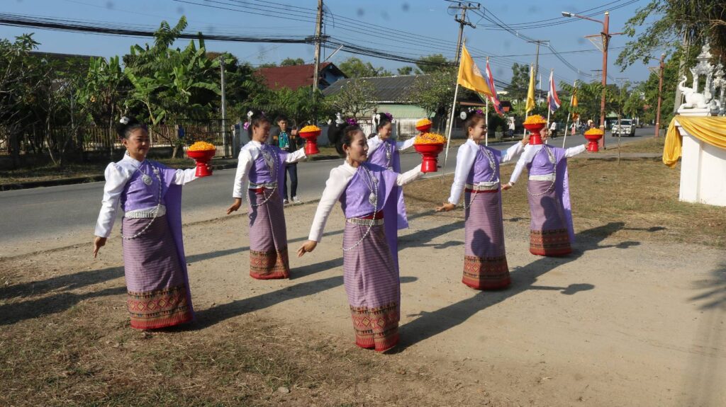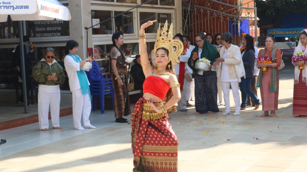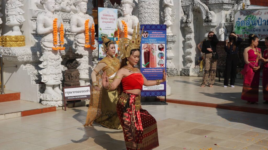 มีการตั้งขบวนฟ้อนที่ลานด้านหน้าพระเจ้าทันใจระยะทางใกล้กับวัดสันป่ายางหลวง เพื่อนำพระรูปท่าน เข้าสู่วัดในเวลา 9 นาฬิกา มีการแสดงฟ้อนรำนำขบวนโดยการโปรยดอก เปรียบเสมือนเปิดทางแม่ธรณี เพื่อได้นำภาพของพระแม่เข้าไปอย่างสมพระเกียรติ และรำเปิดฟ้าเปิดดินพร้อมการรำอัปสราในยุคของทราวดี จะอยู่ที่หน้าวัดสันป่ายางหลวง ฟ้อนรับพระรูป ในชุดฟ้อนหริภุญชัย ของชมรมฟ้อนนครหริภุญชัย