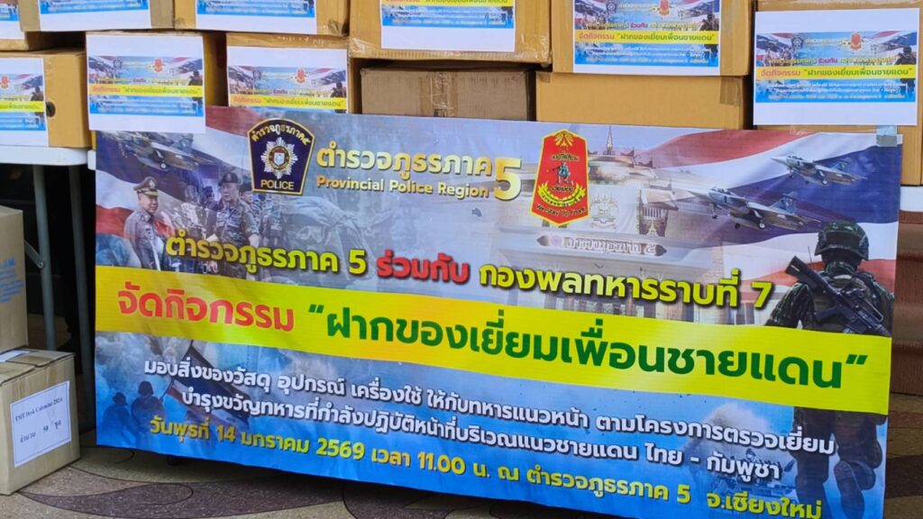 เมื่อวันที่ 14 มกราคม 2569 เวลา 11.00 น.ณ บริเวณหน้าอาคารที่ทำการตำรวจภูธรภาค 5 อำเภอเมือง จังหวัดเชียงใหม่ ได้มีการจัดพิธีส่งมอบสิ่งของอุปโภคบริโภคตามโครงการ “ฝากของเยี่ยมเพื่อนชายแดน” ซึ่งเป็นการผนึกกำลังระหว่างหน่วยงานตำรวจและทหาร เพื่อสนับสนุนการปฏิบัติหน้าที่ของรั้วของชาติ