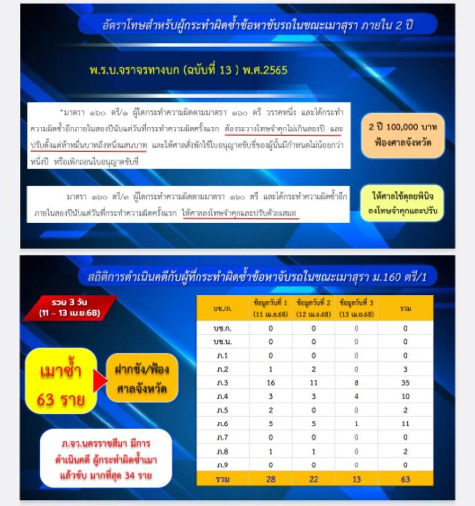 วันนี้ (14 เมษายน 2568) พล.ต.ท.นิธิธร จินตกานนท์ ผู้บัญชาการศึกษา ในฐานะหัวหน้าคณะทำงานฝ่ายเสริมสร้างภาพลักษณ์ตำรวจจราจร ศูนย์บริหารงานจราจร สำนักงานตำรวจแห่งชาติ เปิดเผยว่า ตามที่ศูนย์อำนวยการป้องกันและลดอุบัติเหตุทางถนน สำนักงานตำรวจแห่งชาติ สรุปการเกิดอุบัติเหตุช่วงเทศกาลสงกรานต์ 2568 สะสม 3 วัน (11-13 เมษายน 2568) มียอดจับกุม เมาแล้วขับสูงถึง 11,801 ราย ซึ่งในจำนวนนี้มีผู้ที่ถูกตรวจพบว่าเป็นการกระทำผิดซ้ำ ภายใน 2 ปี นับแต่วันที่กระทำความผิดครั้งที่ผ่านมา มากถึง 63 ราย