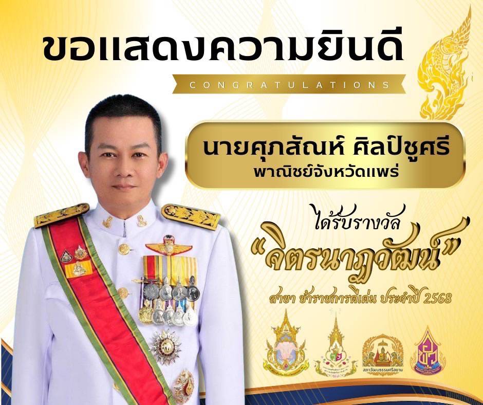 ทั้งนี้ นายศุภสัณห์ ศิลป์ชูศรี พาณิชย์จังหวัดแพร่ ได้รับรางวัลจิตรนาฏวัฒน์ สาขาข้าราชการดีเด่น ประจำปี 2568 ในครั้งนี้ด้วย