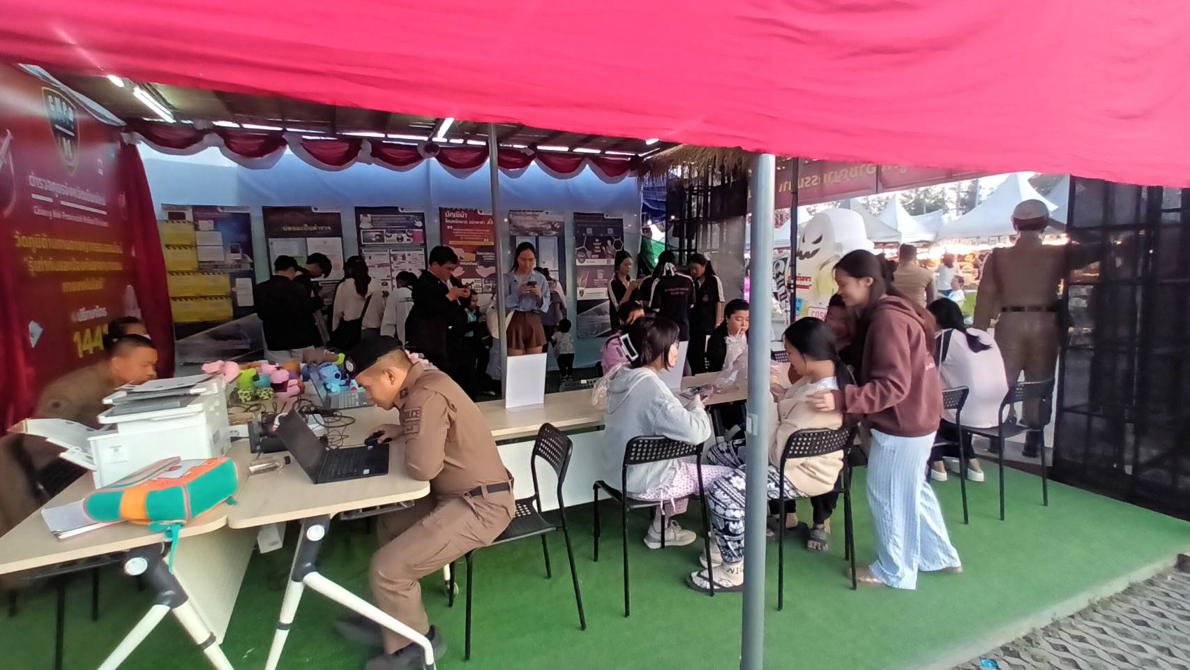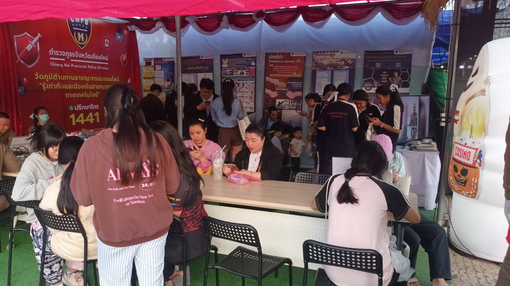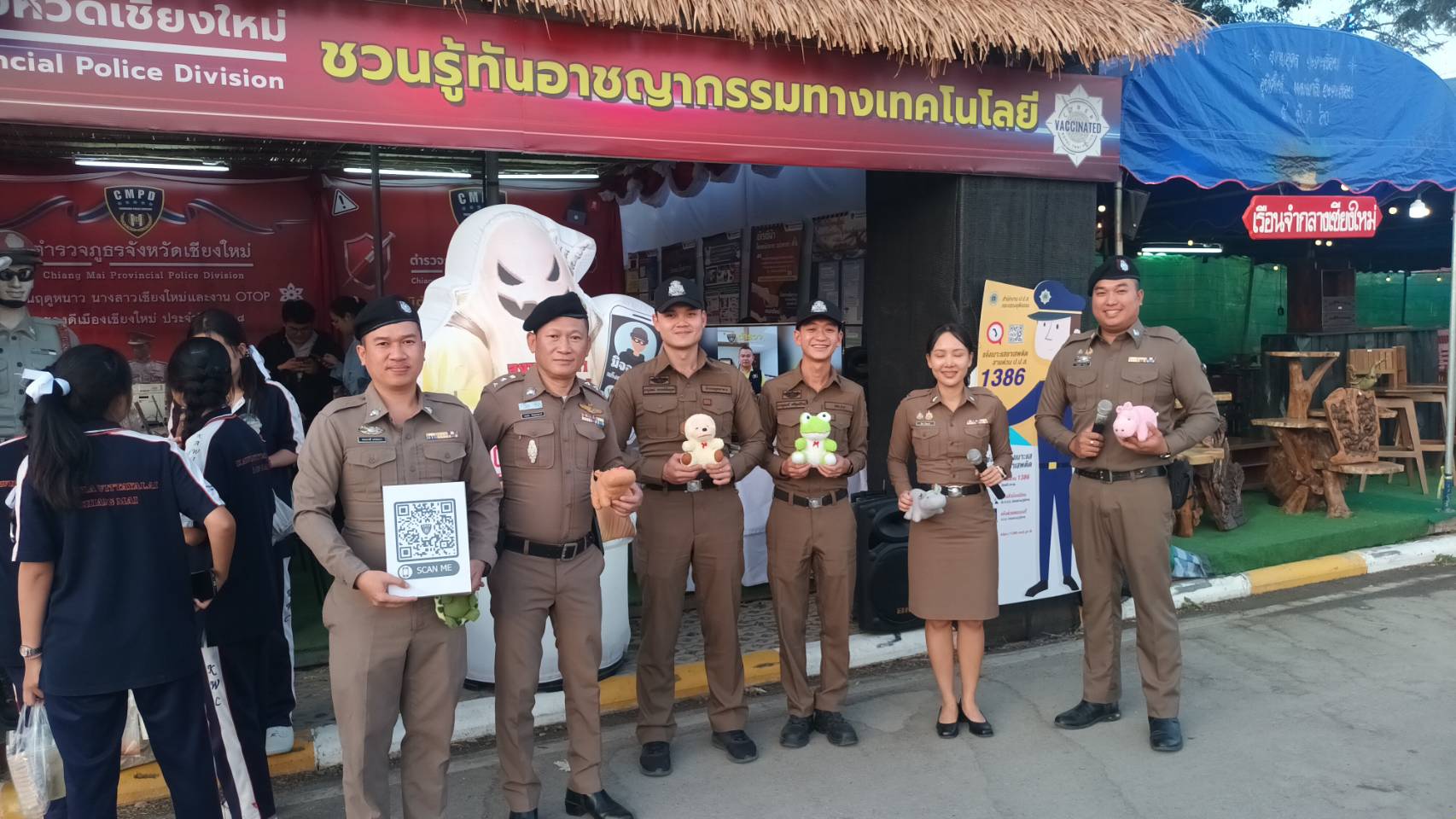 พ.ต.อ.นฤบาล จิตทยานันท์ ผกก.ฯ, มอบหมายให้ พ.ต.ท.วีรพงษ์ พี่งเดชะ รอง ผกก.ป.ฯ, พ.ต.ต.ถวิล กูลพรม สวป.(ชส) และข้าราชการตำรวจ สภ.แม่โจ้ ร่วมจัดกิจกรรมบูธนิทรรศการวัดภูมิต้านทานอาชญากรรมออนไลน์ “รู้เท่าทันและป้องกันอาชญากรรมทางเทคโนโลยี” ณ บูธนิทรรศการของ ภ.จว.เชียงใหม่ ภายในงานกาชาดและงานฤดูหนาว จังหวัดเชียงใหม่ ประจำปี 2568