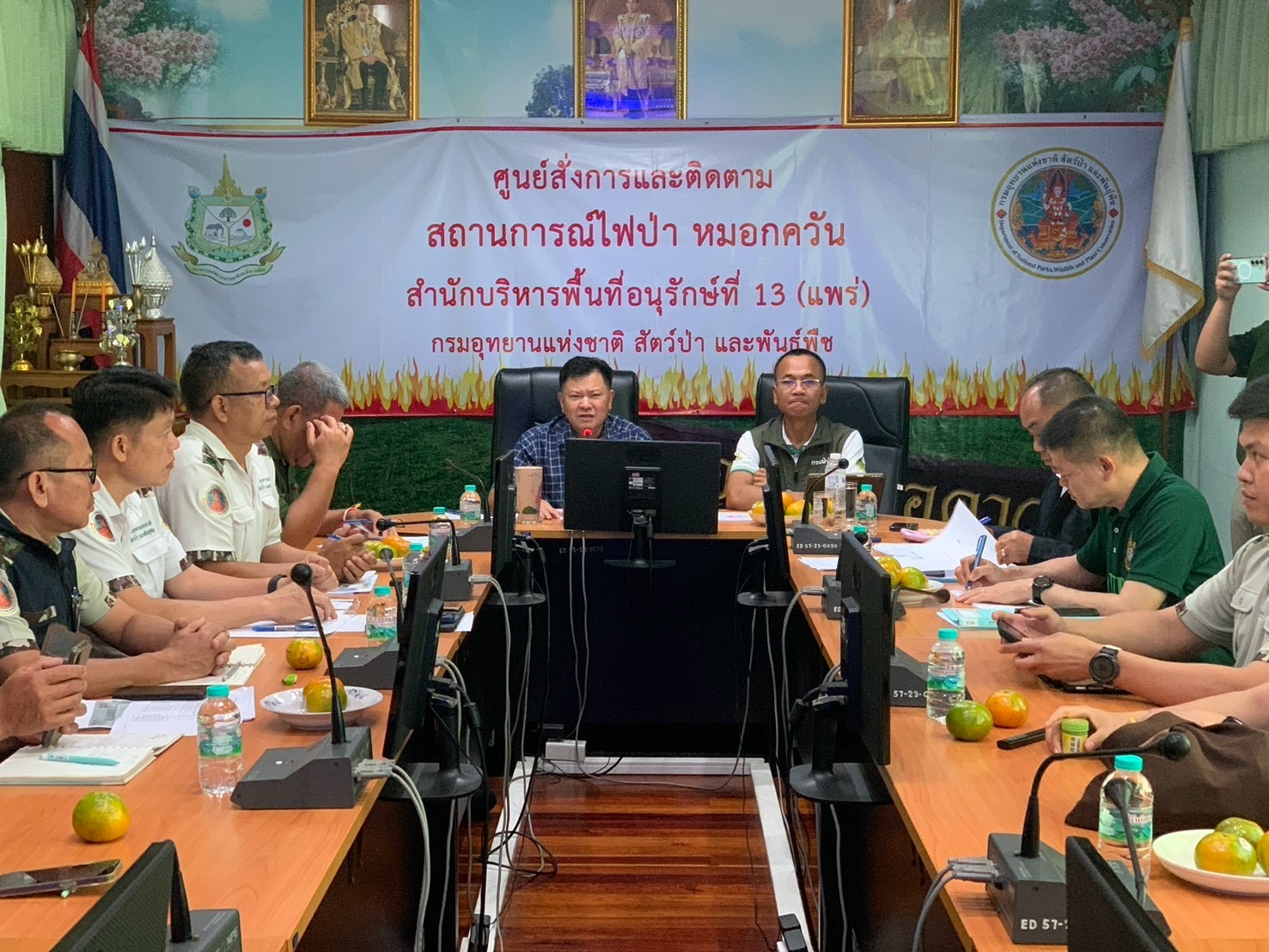 เมื่อวันที่ 14 มีนาคม 2568 นายกรัณย์พล แสงทอง ผู้อำนวยการสำนักบริหารพื้นที่อนุรักษ์ที่ 13 (แพร่) ร่วมกับ นายมานะ จิตฤทธิ์ ผู้อำนวยการสำนักจัดการทรัพยากรป่าไม้ที่ 3 (สาขาแพร่) ร่วมประชุมเพื่อบูรณการ การทำงานร่วมกัน เพื่อแก้ไขปัญหา ไฟป่า หมอกควัน และฝุ่นละออง กับหัวหน้าอุทยานแห่งชาติ หัวหน้าเขตห้ามล่าสัตว์ป่า หัวหน้าเขตรักษาพันธุ์สัตว์ป่า หัวหน้าสถานีควบคุมไฟป่า ชุดปฏิบัติการพิเศษดับไฟป่า (เสือไฟ) หน่วยป้องกันสถานีไฟป่า ชุดสนับสนุนการควบคุมไฟป่า และเจ้าหน้าที่ภาคสนาม ท้องที่จังหวัดแพร่และน่าน เพื่อร่วมกันวางแผนและกำหนดมาตรการ การป้องกันการเกิดสถานการณ์ไฟป่า โดยการใช้เทคโนโลยีภาพถ่ายทางอากาศและภาพถ่ายดาวเทียมวิเคราะห์จุดความร้อน(Hot Spot) ที่เกิดขึ้นในปี พ.ศ. 2566 พ.ศ.2567 เปรียบเทียบกับการเกิดจุดความร้อนในปี 2568 ในการวิเคราะห์เป้าหมายพื้นที่ที่มีความเสี่ยงที่จะเกิดไฟ มีการวางแผนกำลังพล สวิงกำลัง กำหนดจุดเฝ้าระวัง ระดมกำลังพลเจ้าหน้าที่ภาคสนาม เข้าควบคุมการเกิดไฟป่า เพื่อระงับเหตุเกิดไฟป่า ในพื้นที่ป่าสงวนแห่งชาติ และพื้นที่ป่าอนุรักษ์ เพื่อป้องกันและลดความเสี่ยงในการเกิดไฟป่า ในพื้นที่ที่มีความเสี่ยงสูง