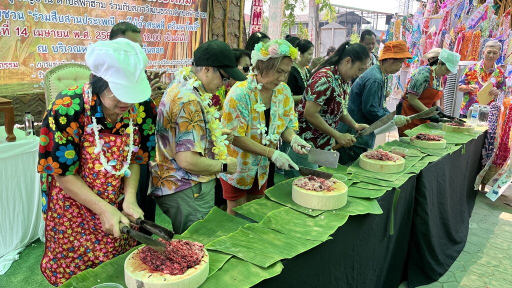 ซึ่งกิจกรรมในช่วงเช้าประชาชนร่วมแข่งขันลาบเนียน(ลาบลีลา) แข่งขันลาบรสชาติ และแข่งขันทำส้มตำลีลา ซึ่งมีทีมเข้าแข่งขันจากทั้งหมด 7 หมู่บ้านและเทศบาลตำบลฟ้าฮ่ามรวม 15 ทีม ซึ่งการแข่งขันทั้งลาบลีลาและการแข่งขันส้มตำลีลาเป็นไปด้วยความสนุกสนานสร้างความประทับใจให้กับชาวบ้านตลอดจนทั้งท่องเที่ยวที่มาร่วมงานเป็นอย่างมาก นอกจากนี้ภายในงานยังมีการจัดแสดงซอพื้นเมืองจากศิลปินช่างชื่อดังบุญทอง ร้องอ้อ มาร่วมขับซอ ให้เข้ากับบรรยากาศช่วงเทศกาลปี๋ใหม่เมือง