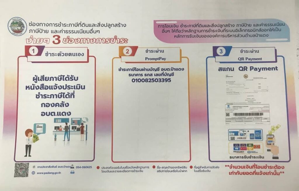 2. สามารถชำระภาษีที่ดินและสิ่งปลูกสร้างโดยการโอนเข้าบัญชีเงินฝากธนาคาพื่อการเกษตรและสหกรณ์การเกษตร ชื่อบัญชี “องค์การบริหารส่วนตำบลป่าแดง” ตามยอดการประเมินที่ท่านได้รับในหนังสือแจ้งการประเมิน 3. เมื่อได้รับจดหมายและมีคิวอาร์โค้ดเพื่อสแกนจ่าย ท่านสามารถสแกนจ่ายด้วยโทรศัพท์ผ่านแอปธนาคารได้ทุกธนาคาร (แอปธนาคาร ธกส. จ่ายค่าธรรมเนียม 15 บาท)