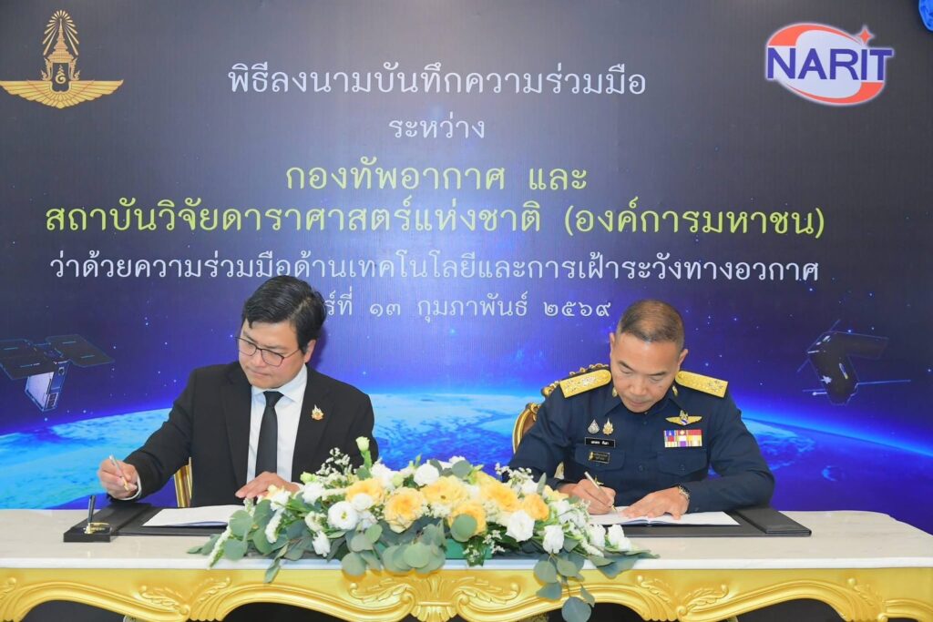 เมื่อวันที่ 13 กุมภาพันธ์ 2569 – กรุงเทพฯ สถาบันวิจัยดาราศาสตร์แห่งชาติ (องค์การมหาชน) (สดร.) หรือ NARIT กระทรวงการอุดมศึกษา วิทยาศาสตร์ วิจัย และนวัตกรรม (อว.) โดย ดร. วิภู รุโจปการ ผู้อำนวยการสถาบันวิจัยดาราศาสตร์แห่งชาติ และกองทัพอากาศ (ทอ.) โดย พลอากาศเอก เสกสรร คันธา ผู้บัญชาการทหารอากาศ ลงนามบันทึกข้อตกลงความร่วมมือด้านเทคโนโลยีและการเฝ้าระวังทางอวกาศ เพื่อส่งเสริมศักยภาพด้านเทคโนโลยีและการเฝ้าระวังทางอวกาศ ยกระดับขีดความสามารถในการพัฒนาบุคลากรของประเทศ และสนับสนุนภารกิจด้านความมั่นคงทางอวกาศของชาติ พิธีลงนามจัดขึ้น ณ กองบัญชาการกองทัพอากาศ (บก.ทอ.) เขตดอนเมือง