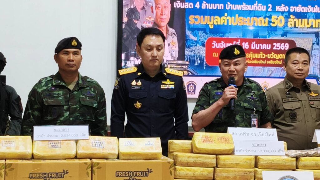 ต่อมาในวันที่ 13 มีนาคม 2569 บริเวณด่านตรวจปูแกง สภ.พาน จ.เชียงราย เจ้าหน้าที่ตรวจพบรถกระบะตู้ทึบต้องสงสัยขับเข้ามาด้วยท่าทีพิรุธ เมื่อตรวจสอบภายในพบว่ามีการบรรทุกต้นกระเทียมสดที่เริ่มเน่าเสียเพื่ออำพรางกลิ่น แต่ไม่พ้นสายตาเจ้าหน้าที่ เมื่อรื้อค้นโดยละเอียดพบยาบ้าซุกซ่อนอยู่ถึง 10 กระสอบ รวมประมาณ 2.03 ล้านเม็ด จึงจับกุมตัวคนขับดำเนินคดี