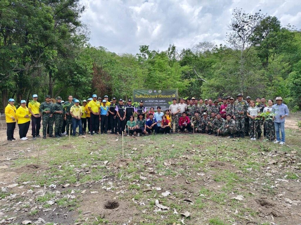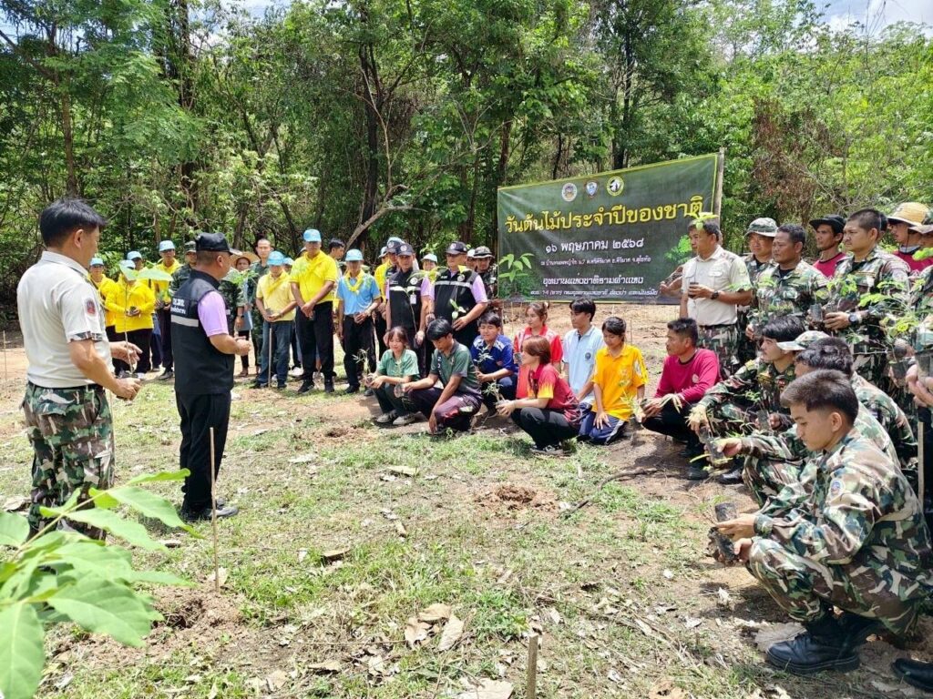 เมื่อ เวลา 13.30น.ของวันที่16 พค.2568 พ.อ.พิทยา ราชะพริ้ง รอง ผอ.รมน.จังหวัด ส.ท.(ท.) พร้อมด้วย จนท.กอ.รมน.จังหวัด ส.ท. ร่วมกับ จนท.อุทยานแห่งชาติรามคำแหง, ประชาชนจิตอาสา, จนท.ดับไฟป่า, ชป.ลว.พัน.ซบร.23 บชร.3, ชป,ลว.พัน.ขส.23 บชร.3, ผู้นำท่องที่ท้องถิ่น นักเรียนนักศึกษา และประชาชนในพื้นที่ ดำเนินการปลูกต้นไม้ เนื่องในวันต้นไม้แห่งชาติ 2568 เพื่อฟื้นฟูป่าไม้ และเพิ่มพื้นที่สีเขียว ซึ่งช่วยในการดูดซับคาร์บอนไดออกไซด์และปล่อยออกซิเจนให้กับโลก ต้นไม้ยังมีบทบาทสำคัญในการลดมลพิษป้องกันการพังทลายของดิน และรักษาความหลากหลายทางชีวภาพการปลูกต้นไม้ในวันนี้จึงเป็นการลงทุนเพื่ออนาคตที่ยั่งยืนและเป็นมิตรกับสิ่งแวดล้อม ซึ่งได้ดำเนินปลูก ต้นสัก, ต้นมะค่า, ต้นมะคึก, ต้นพยุง และต้นไผ่ จำนวน 500 ต้น ในพืัน 3 ไร่ ณ พื้นที่อุทยานแห่งชาติรามคำแหง ม.7 บ้านหนองหญ้าไซร ต.ศรีคีรีมาศ อ.คีรีมาศ จังหวัด.สุโขทัย