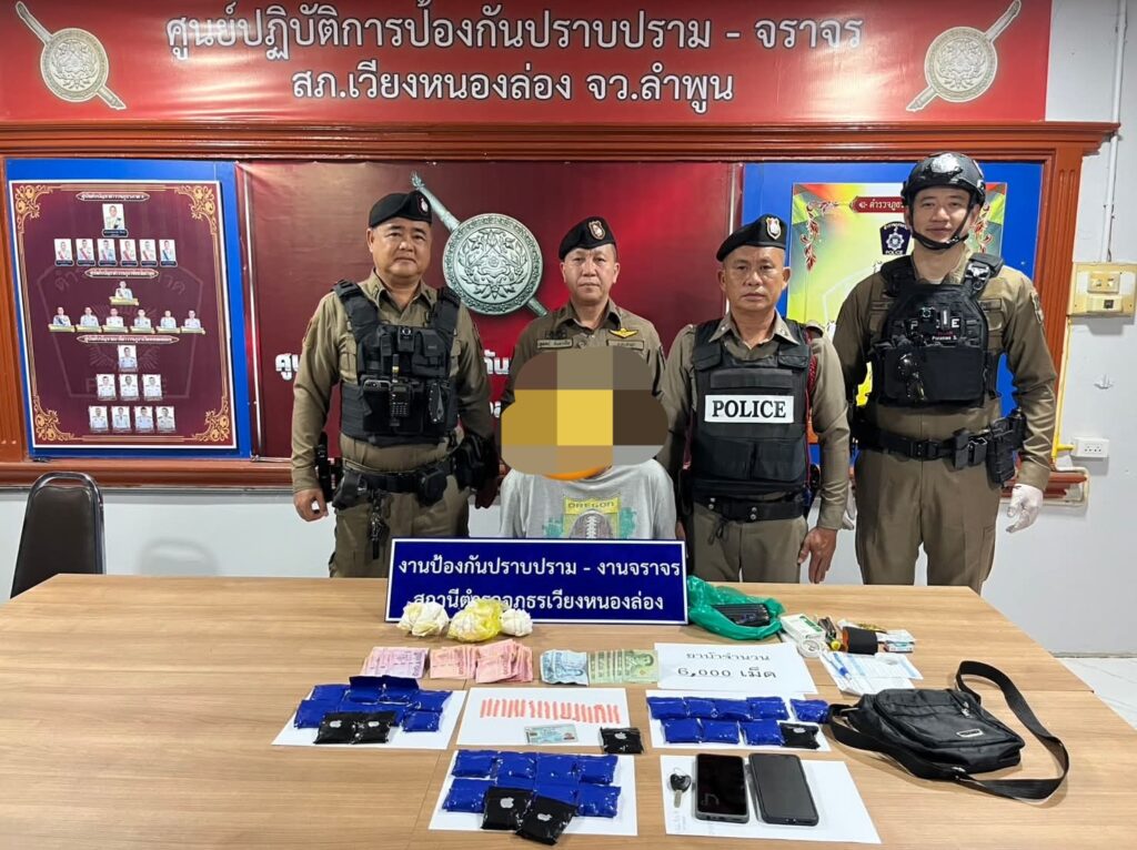 ลำพูน-ตำรวจภูธรจังหวัดลำพูน สภ.เวียงหนองล่อง รวบผู้ต้องหายาเสพติด พร้อมของกลางยาบ้า 6 พันเม็ด ส่งดำเนินคดี