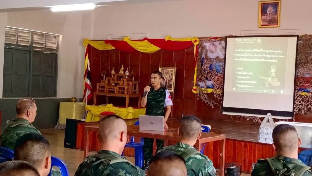 เมื่อวันที่ 16 กันยายน 2568 โรงพยาบาลค่ายกาวิละ โดยทีมส่งเสริมสุขภาพและเวชกรรมป้องกัน ร่วมกับทีมครู ก. จัดการอบรมให้ความรู้แก่กำลังพลกองพันสัตว์ต่าง กรมการสัตว์ทหารบก ที่จะขึ้นปฏิบัติภารกิจป้องกันชายแดน ณ ค่ายตากสิน อำเภอแม่ริม จังหวัดเชียงใหม่ การอบรมครั้งนี้ครอบคลุมทั้งภาคทฤษฎีและปฏิบัติ ตั้งแต่การช่วยชีวิตขั้นพื้นฐาน การปฏิบัติการฟื้นคืนชีพด้วยการปั๊มหัวใจร่วมกับการใช้เครื่องกระตุ้นไฟฟ้าหัวใจอัตโนมัติ การปฐมพยาบาลเบื้องต้นและการใช้อุปกรณ์ช่วยชีวิตประจำกาย การเคลื่อนย้ายผู้บาดเจ็บทางยุทธวิธี การช่วยเหลือผู้ป่วยสำลักอาหาร ตลอดจนการดูแลสุขาภิบาลสนาม