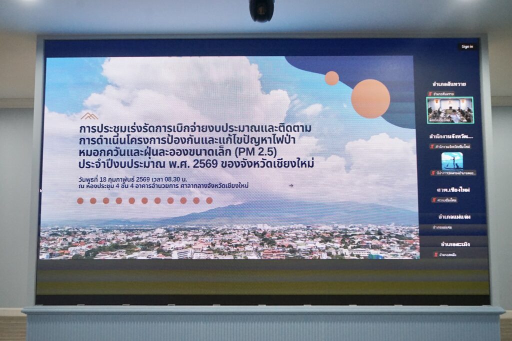 วันนี้ (18 ก.พ. 69) ที่ห้องประชุม 4 ชั้น 4 อาคารอำนวยการ ศาลากลางจังหวัดเชียงใหม่ นายรัฐพล นราดิศร ผู้ว่าราชการจังหวัดเชียงใหม่ เป็นประธานการประชุมเร่งรัดการเบิกจ่ายงบประมาณและติดตามการดำเนินโครงการป้องกันและแก้ไขปัญหาไฟป่า หมอกควัน และฝุ่นละอองขนาดเล็ก (PM 2.5) ประจำปีงบประมาณ พ.ศ. 2569 ของจังหวัดเชียงใหม่ โดยมี นายศิวกร บัวป้อง รองผู้ว่าราชการจังหวัดเชียงใหม่ หัวหน้าส่วนราชการ และหน่วยงานที่เกี่ยวข้องเข้าร่วมประชุม