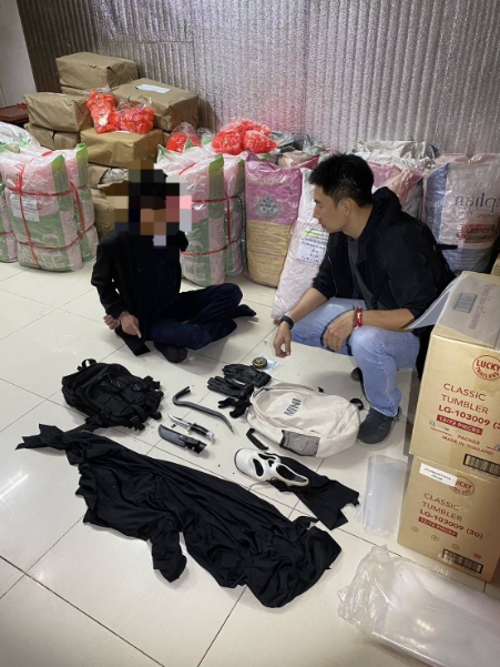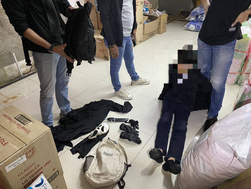 หลังรับแจ้งเหตุจึงยกกำลังไปที่ห้งดังกล่าวบริเวณชั้นสอง ก็พบคนร้ายซ่อนตัวในช่องตู้เก็บของภายในร้าน เจ้าหน้าที่จึงจับกุมตัวไว้ได้ทราบชื่อนายเอศรา อายุ 21 ปี ชาวอำเภอนาน้อย จ.น่าน พร้อมของกลางปั๊มลม เหล็กแหลมหนึ่งด้าม ชุดคลุมสีดำพร้อมหน้ากากผี
