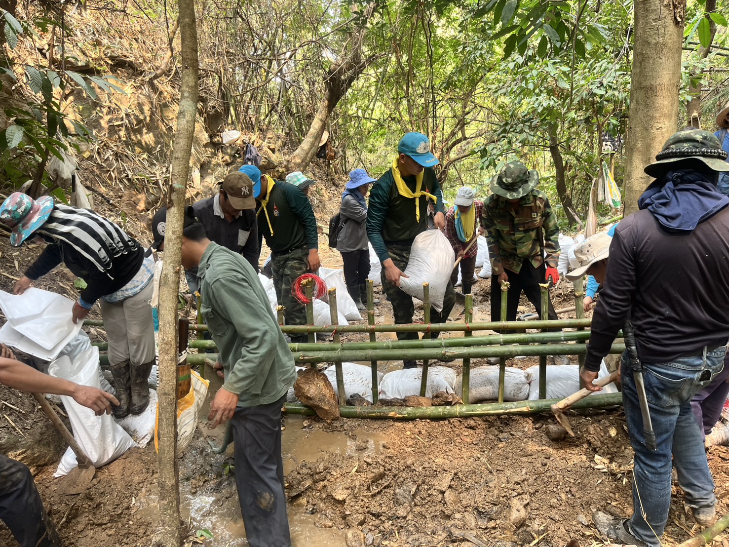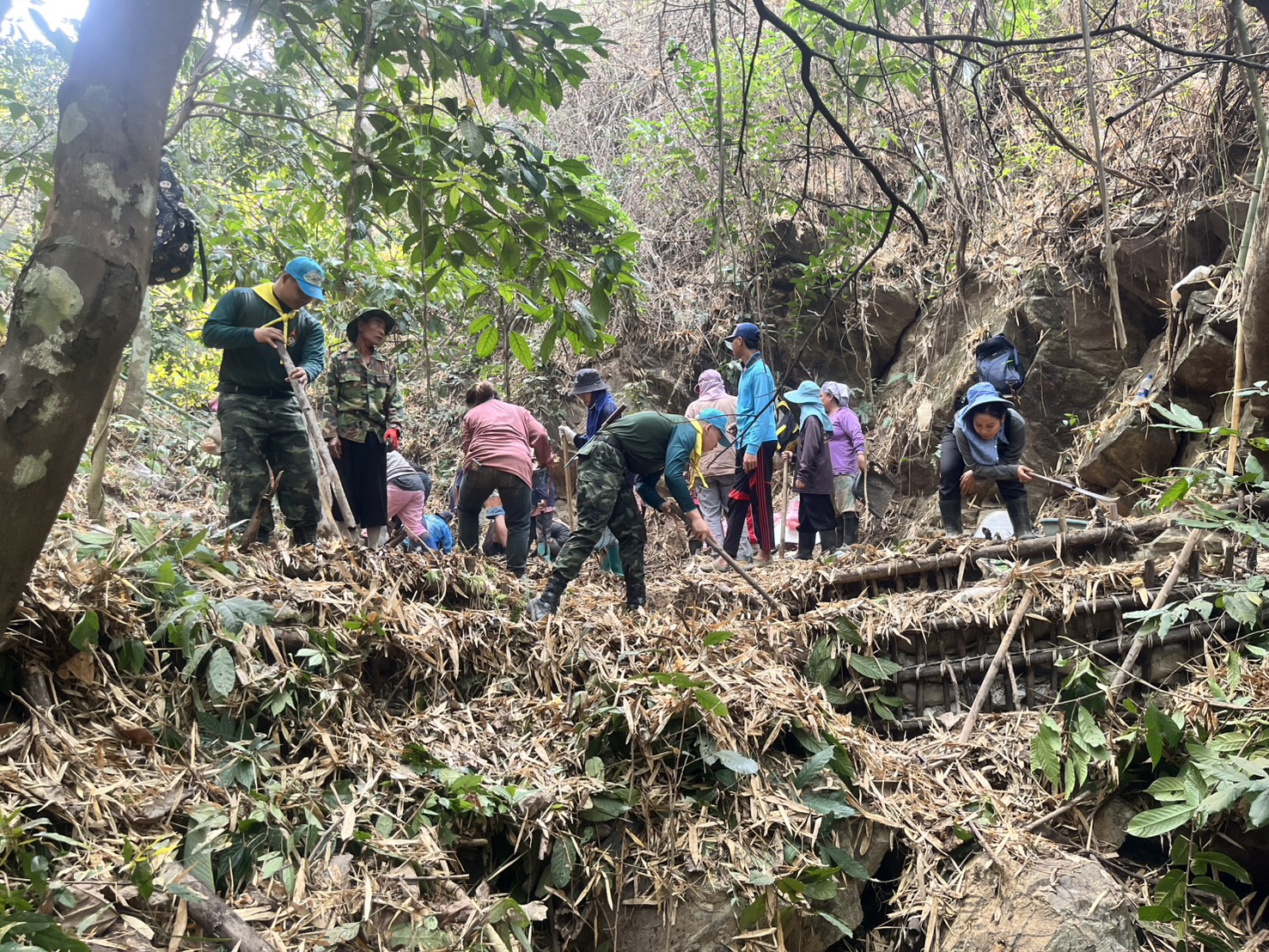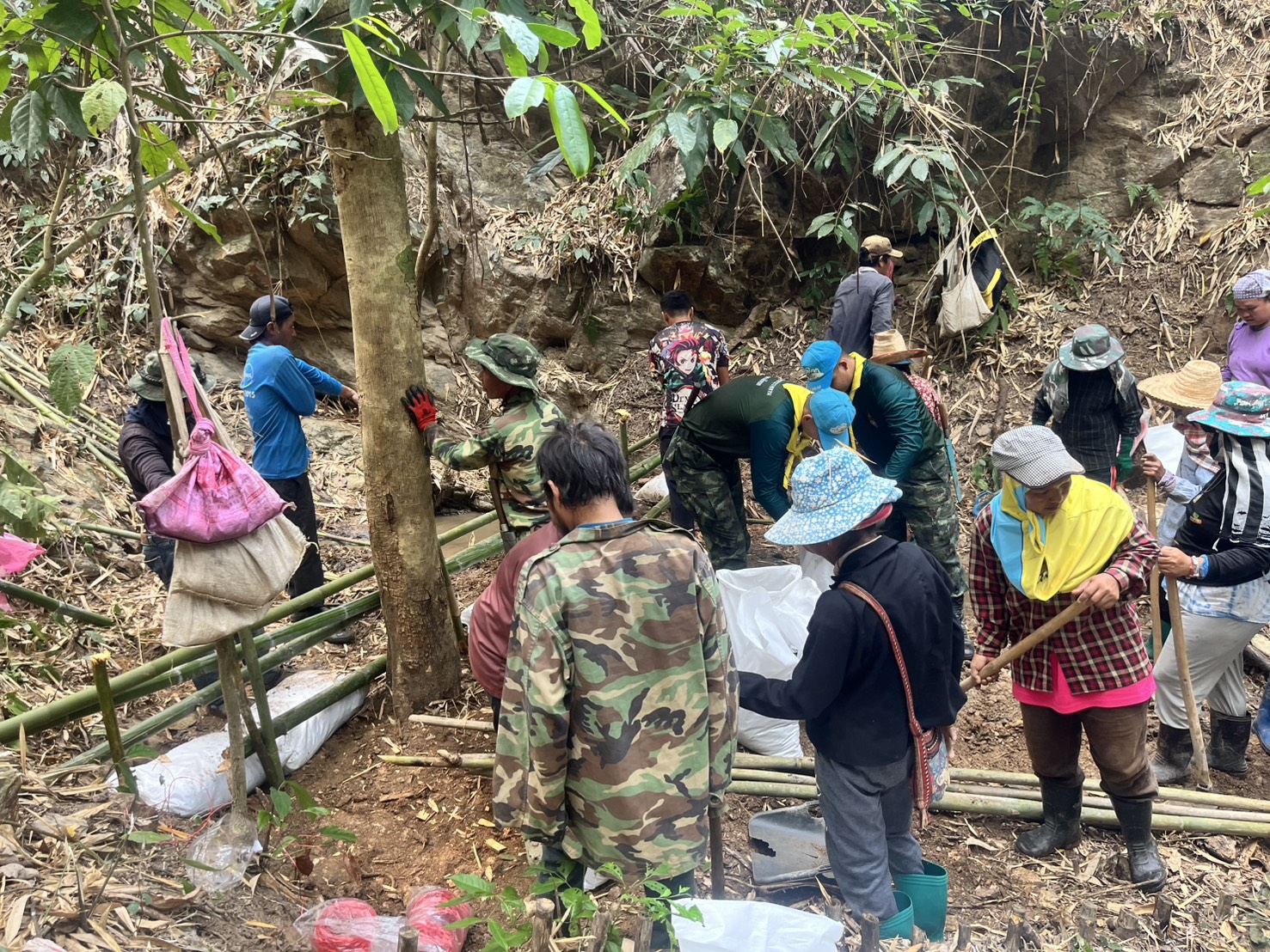 เมื่อวันที่ 17 มี.ค. 68 เวลา 08.00 – 16.30 น. กกล.ผาเมือง/กอ.รมน.ภาค 3 สย.2 โดย ชพส.3214ฯ บูรณาการร่วมกับ ผู้นำหมู่บ้าน และประชาชน บ.วังผา ม.6 ต.ท่าข้าม อ.เวียงแก่น จัดกิจกรรมขับเคลื่อนโครงการสร้างฝายชะลอน้ำตามแนวพระราชดำริ ในการแก้ไขปัญหาภัยแล้ง และอุทกภัย ตามแผนปฏิบัติการป้องกันภัยชุมชน โดยการสร้างฝายชะลอน้ำขนาดเล็ก (ฝายชั่วคราว) เพื่อชะลอความแรงของน้ำในพื้นที่ป่า บ.วังผา ม.6 ต.ท่าข้าม อ.เวียงแก่น จว.ช.ร.จำนวน 14 ฝาย มีผู้ร่วมกิจกรรมจำนวน 70 คน