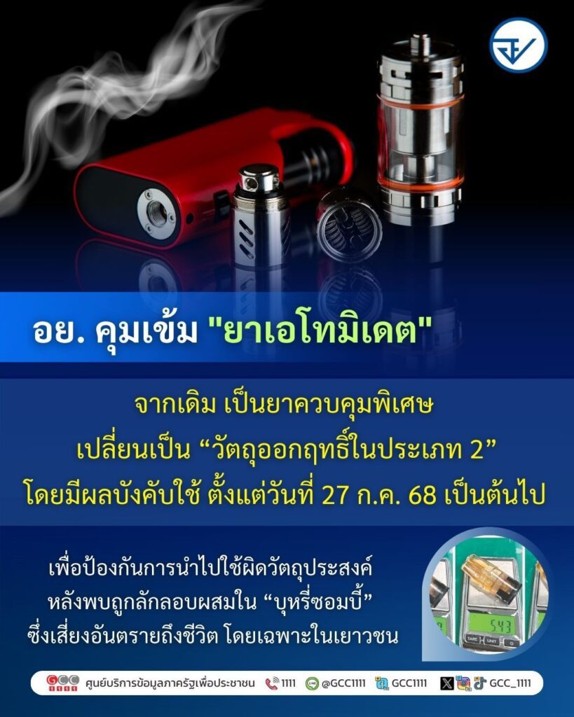 หลังพบแนวโน้มถูกนำไปใช้ในทางที่ผิด โดยลักลอบผสมในน้ำยาบุหรี่ไฟฟ้า กลายเป็น “บุหรี่ซอมบี้” ที่ออกฤทธิ์คล้ายยาเสพติด ⚠️ เสี่ยงหมดสติ หยุดหายใจ หรือเสียชีวิต โดยเฉพาะในกลุ่มเยาวชน