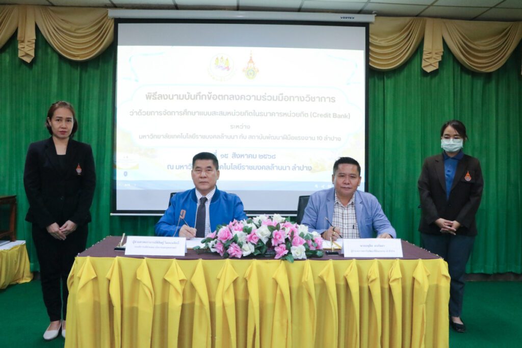 เมื่อวันที่ 15 สิงหาคม 2568 ผศ.พิสิษฐ์ วิมลธนสิทธิ์ รองอธิการบดี ฝ่ายแผน นโยบายและยุทธศาสตร์ มหาวิทยาลัยเทคโนโลยีราชมงคลล้านนา ลงนามบันทึกข้อตกลงความร่วมมือทางวิชาการ (MOU) ร่วมกับนายอนุชิต ดรกันยา ผู้อำนวยการสถาบันพัฒนาฝีมือแรงงาน 10 ลำปาง เพื่อร่วมกันพัฒนาระบบการจัดการศึกษาในรูปแบบ “ธนาคารหน่วยกิต” (Credit Bank) เป็นการส่งเสริมและสนับสนุนให้ประชาชนสามารถเรียนรู้ได้ตลอดชีวิต โดยมีคณะผู้บริหาร 2 หน่วยงานร่วมเป็นสักขีพยาน ณ ห้องประชุม 1 มทร.ล้านนา ลำปาง