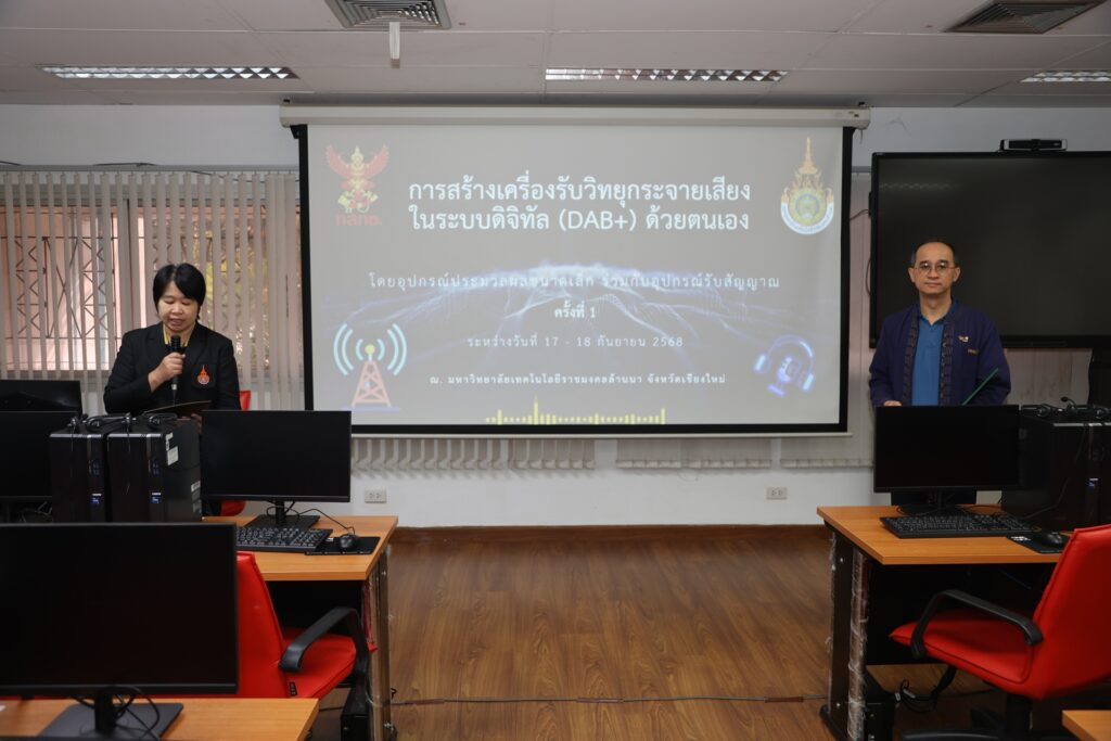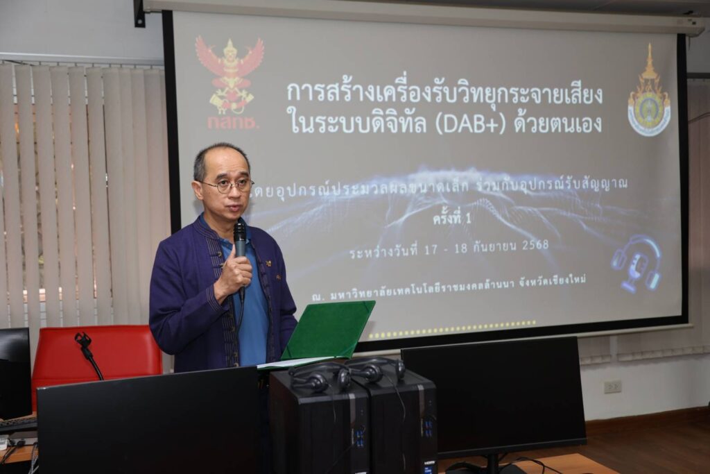 มหาวิทยาลัยเทคโนโลยีราชมงคลล้านนา ร่วมกับ สำนักงานคณะกรรมการกิจการกระจายเสียง กิจการโทรทัศน์ และกิจการโทรคมนาคมแห่งชาติ (กสทช.) จัดอบรมเชิงปฏิบัติการ “การสร้างเครื่องรับวิทยุกระจายเสียงในระบบดิจิทัลด้วยตนเอง โดยอุปกรณ์ประมวลผลข้อมูลขนาดเล็กร่วมกับอุปกรณ์รับสัญญาณ DAB+” ณ ห้อง Thin 1 อาคารสำนักวิทยบริการและเทคโนโลยีสารสนเทศ มทร.ล้านนา ระหว่างวันที่ 17–18 กันยายน 2568