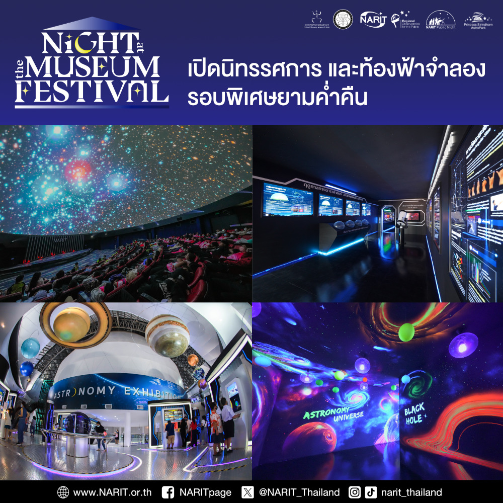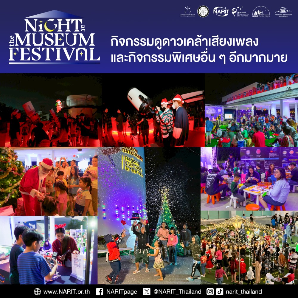 สถาบันวิจัยดาราศาสตร์แห่งชาติ (องค์การมหาชน) (สดร. หรือ NARIT) กระทรวงการอุดมศึกษา วิทยาศาสตร์ วิจัยและนวัตกรรม (อว.) ชวนเที่ยวนิทรรศการดาราศาสตร์ ท้องฟ้าจำลองรอบพิเศษยามค่ำคืน พร้อมกิจกรรมมากมายส่งท้ายเทศกาลคริสต์มาส และเพลิดเพลินกับการชมดาวเคล้าเสียงเพลง ใน “NARIT Night at the Museum 2025” วันที่ 27 – 28 ธันวาคม 2568 เวลา 10:00 – 22:00 น. ณ อุทยานดาราศาสตร์สิรินธร อ. แม่ริม จ. เชียงใหม่ และหอดูดาวภูมิภาคสำหรับประชาชนทั้ง 4 แห่ง ที่นครราชสีมา ขอนแก่น ฉะเชิงเทรา และสงขลา
