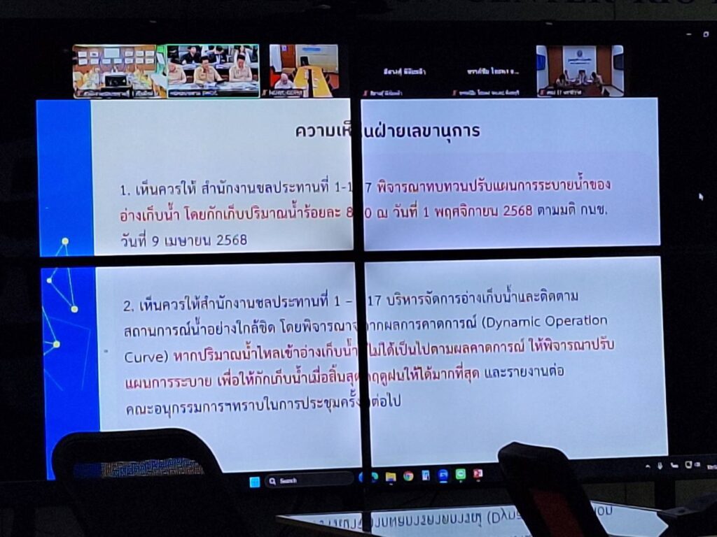 ด้านในที่ประชุมทั้งนี้มีวาระการประชุมที่สำคัญคือวาระการพิจารณา การปรับแผนการระบายน้ำให้เป็นไปตามมติของคณะกรรมการทรัพยากรน้ำแห่งชาติ หรือ กนช. ซึ่งมีมติเมื่อวันที่ 5 เมษายน 2568 ให้มีการทบทวนปรับแผนการระบายน้ำของอ่างเก็บน้ำ โดยกักเก็บปริมาณน้ำที่ร้อยละ 80 ของความจุอ่าง ณ วันที่ 1 พ.ย. 2568