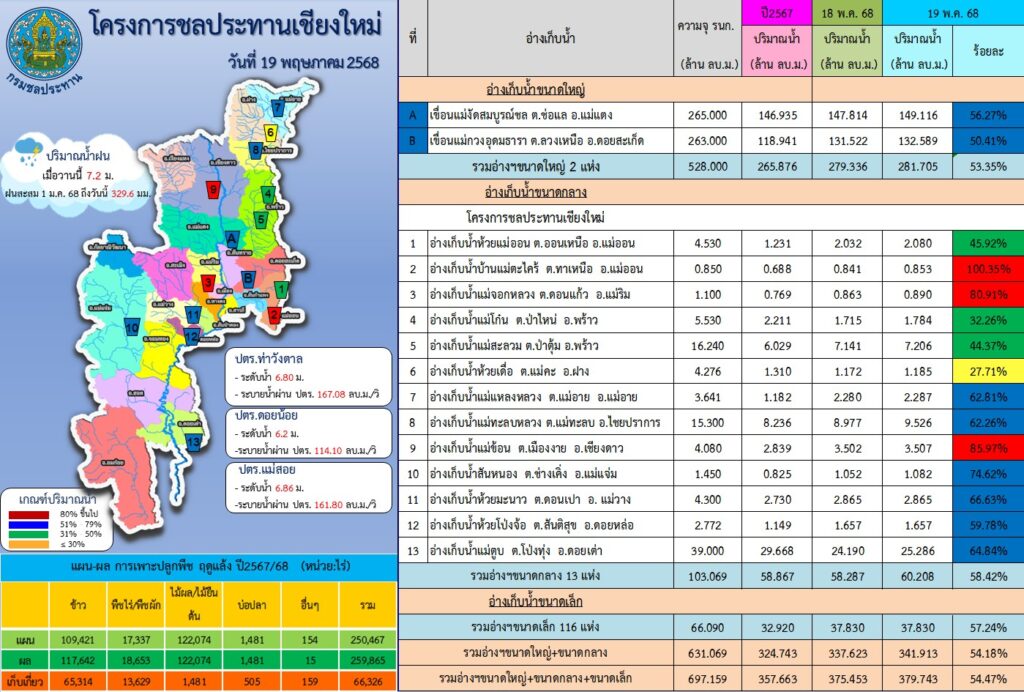 วันที่ 19 พ.ค. 68 นายชนม์ฐพัฒน์ เครือศรี หัวหน้าฝ่ายจัดสรรน้ำและปรับปรุงระบบชลประทาน โครงการชลประทานเชียงใหม่ กล่าวว่า นายเกื้อกูล มานะสัมพันธ์สกุล ผู้อำนวยการโครงการชลประทานเชียงใหม่ ได้สั่งการให้เจ้าหน้าที่ทุกฝ่ายเตรียมความพร้อมตาม 9 มาตรการฤดูฝน ของกรมชลประทานที่มอบนโยบายไว้ ในเรื่องของการคาดการณ์ ชี้เป้า ซึ่งทางโครงการชลประทานเชียงใหม่ ก็ได้ดำเนินการกำหนดพื้นที่เสี่ยงภัยและฝนทิ้งช่วงไว้แล้ว