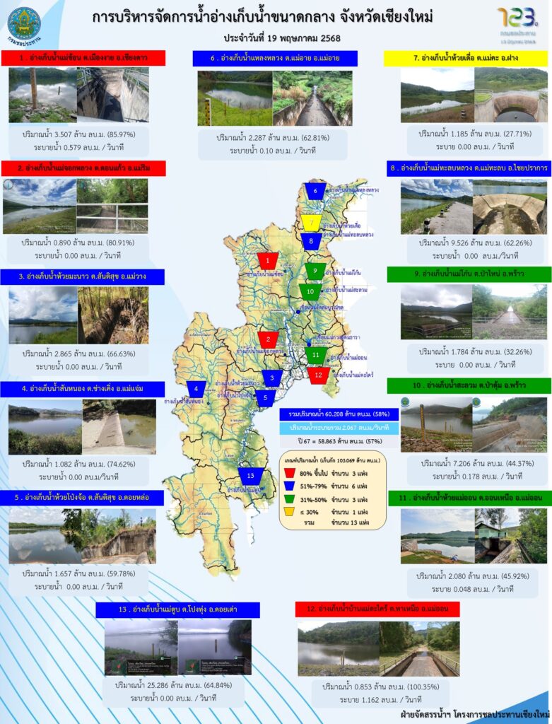 สำหรับการบริหารจัดการน้ำทางสำนักงานทรัพยากรน้ำแห่งชาติ (สทนช.) ก็ได้กำหนดนโยบายในช่วงฤดูฝน เนื่องจากมีฝนตกลงมาอย่างต่อเนื่อง ก็ให้เก็บกักน้ำไว้ในเขื่อนไม่ควรเกิน 80 เปอร์เซ็นต์ของความจุอ่างเก็บน้ำ ซึ่งอ่างเก็บน้ำขนาดกลางของจังหวัดเชียงใหม่ มีอยู่ 13 แห่ง และอ่างเก็บน้ำที่มีปริมาณน้ำเกิน 80 เปอร์เซ็นต์ มีจำนวน 3 แห่ง ได้แก่ อ่างเก็บน้ำแม่ตะไคร้ ต.ทาเหนือ อ.แม่ออน, อ่างเก็บน้ำแม่จอกหลวง ต.ดอนแก้ว อ.แม่ริม และอ่างเก็บน้ำแม่ข้อน ต.เมืองงาย อ.เชียงดาว ก็ได้ดำเนินการพร่องน้ำไปแล้ว (วันนี้เป็นวันที่สาม) ปริมาณน้ำรวมกว่า 200,000 ลบ.ม. ปริมาณน้ำระบายดังกล่าวจะทำให้ปริมาณน้ำในอ่างเก็บน้ำจะอยู่ในเกณฑ์ที่ไม่เกินร้อยละ 80 ภายในสัปดาห์นี้ สำหรับอ่างเก็บน้ำอื่นๆ ที่เหลืออีก 10 แห่ง มีปริมาณน้ำรวม 60 ล้าน ลบ.ม. คิดเป็นร้อยละ 58 สามารถเก็บกักน้ำเพื่อรองรับน้ำหลากได้ถึง 20 เปอร์เซ็นต์ จนกว่าจะถึงร้อยละ 80