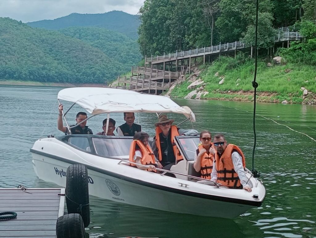 จากนั้น ผู้อำนวยการโครงการฯ ได้นำคณะผู้แทน USACE และUSGS เข้าเยี่ยมชมการบริหารจัดการน้ำบริเวณเขื่อนแม่งัดสมบูรณ์ชล โรงไฟฟ้าเขื่อนแม่งัดสมบูรณ์ชล และลงเรือเก็บตัวอย่างตะกอนและน้ำในเขื่อนแม่งัดสมบูรณ์ชล เพื่อนำไปวิเคราะห์ต่อไป