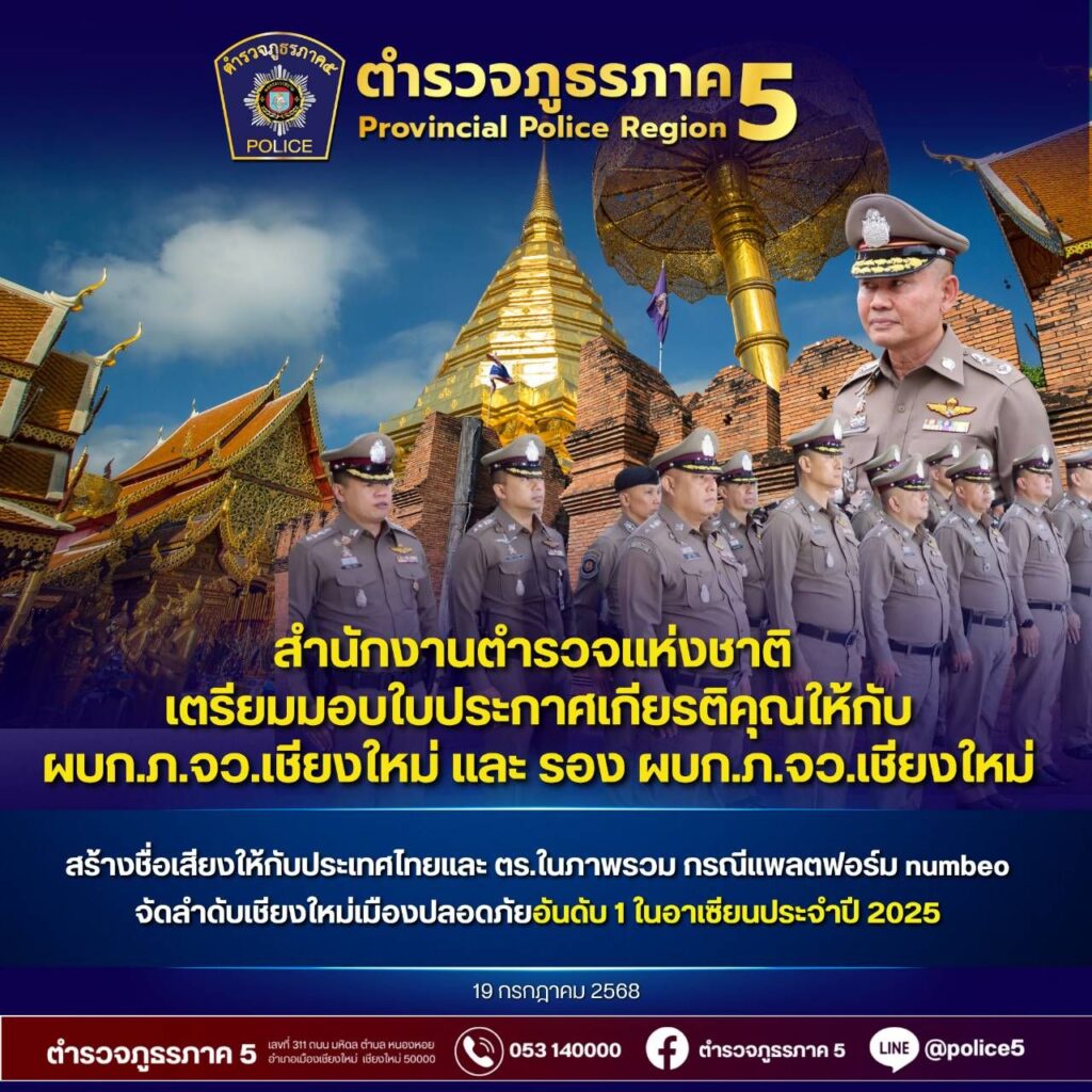 สำนักงานตำรวจแห่งชาติ เตรียมมอบใบประกาศเกียรติคุณให้กับ ผบก.ภ.จว.เชียงใหม่ และ รอง ผบก.ภ.จว.เชียงใหม่ สร้างชื่อเสียงให้กับประเทศไทยและ ตร.ในภาพรวม กรณีแพลตฟอร์ม numbeo จัดลำดับเชียงใหม่เมืองปลอดภัยอันดับ 1 ในอาเซียนประจำปี 2025