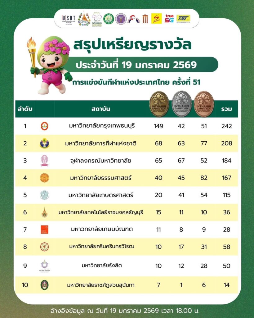 การแข่งขันกีฬามหาวิทยาลัยแห่งประเทศไทย ครั้งที่ 51 “อินทนิลเกมส์ 2026” ระหว่างวันที่ 9-19 มกราคม 2569 ซึ่งมหาวิทยาลัยแม่โจ้ ร่วมกับ จังหวัดเชียงใหม่ และเครือข่าย 12 สถาบันอุดมศึกษาในจังหวัดเชียงใหม่ เป็นเจ้าภาพจัดการแข่งชัน โดยมีสถาบันการศึกษาระดับอุดมศึกษาทั่วประเทศ 109 สถาบันเข้าร่วมการแข่งขันกว่า 40 ชนิดกีฬา มีการชิงชัย 520 เหรียญ ซึ่งมหาวิทยาลัยกรุงเทพธนบุรี กวาดมาได้ 149 เหรียญทอง 42 เหรียญเงิน 51 เหรียญทองแดง รวม 242 เหรียญ เป็นเจ้าเหรียญทอง ตามมาด้วย มหาวิทยาลัยการกีฬาแห่งชาติ 68 เหรียญทอง และ จุฬาลงกรณ์มหาวิทยาลัย 65 เหรียญทอง ในขณะที่มหาวิทยาลัยแม่โจ้เจ้าภาพจัดการแข่งขัน ทำผลงานได้ 2 เหรียญทอง 4 เหรียญเงิน และ 5 เหรียญทองแดง อยู่อันดับที่ 28 ของตาราง