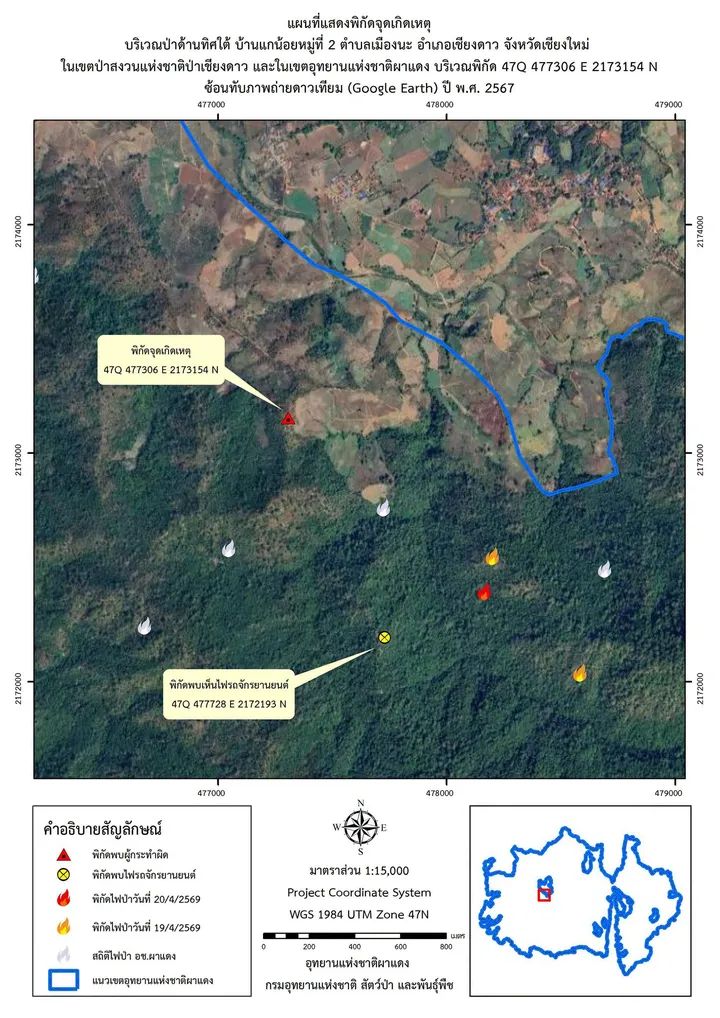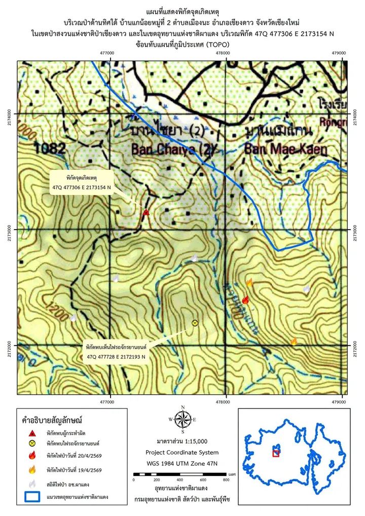 วันที่ 19 เมษายน 2569 นายประกาศิต ระวิวรรณ หัวหน้าอุทยานแห่งชาติผาแดง รายงานว่า ตั้งแต่เวลา 20.00 น. เป็นต้นไป เจ้าหน้าที่ชุดสายตรวจปราบปรามส่วนกลาง ออกลาดตระเวนตั้งด่านตรวจคนลักลอบเข้าป่า ลักลอบเผาป่าและล่าสัตว์ ในช่วงเวลากลางคืน พื้นที่ป่าในเขตอุทยานแห่งชาติผาแดง บริเวณบ้านแกน้อย หมู่ที่ 2 ตำบลเมืองนะ อำเภอเชียงดาว จังหวัดเชียงใหม่ ซึ่งบริเวณพื้นที่ดังกล่าวมีการเกิดเหตุไฟไหม้ซ้ำซาก และได้รับรายงานจุดความร้อน (Hotspot) ต่อเนื่องเป็นเวลาหลายวัน เจ้าหน้าที่เข้าทำการดับไฟจนสนิทแล้ว แต่พบไฟเกิดขึ้นใหม่อีกหลายครั้ง จึงสันนิษฐานได้ว่า พื้นที่ดังกล่าวต้องมีการลักลอบเข้ามาเพื่อเก็บหาของป่า เผาป่าและล่าสัตว์