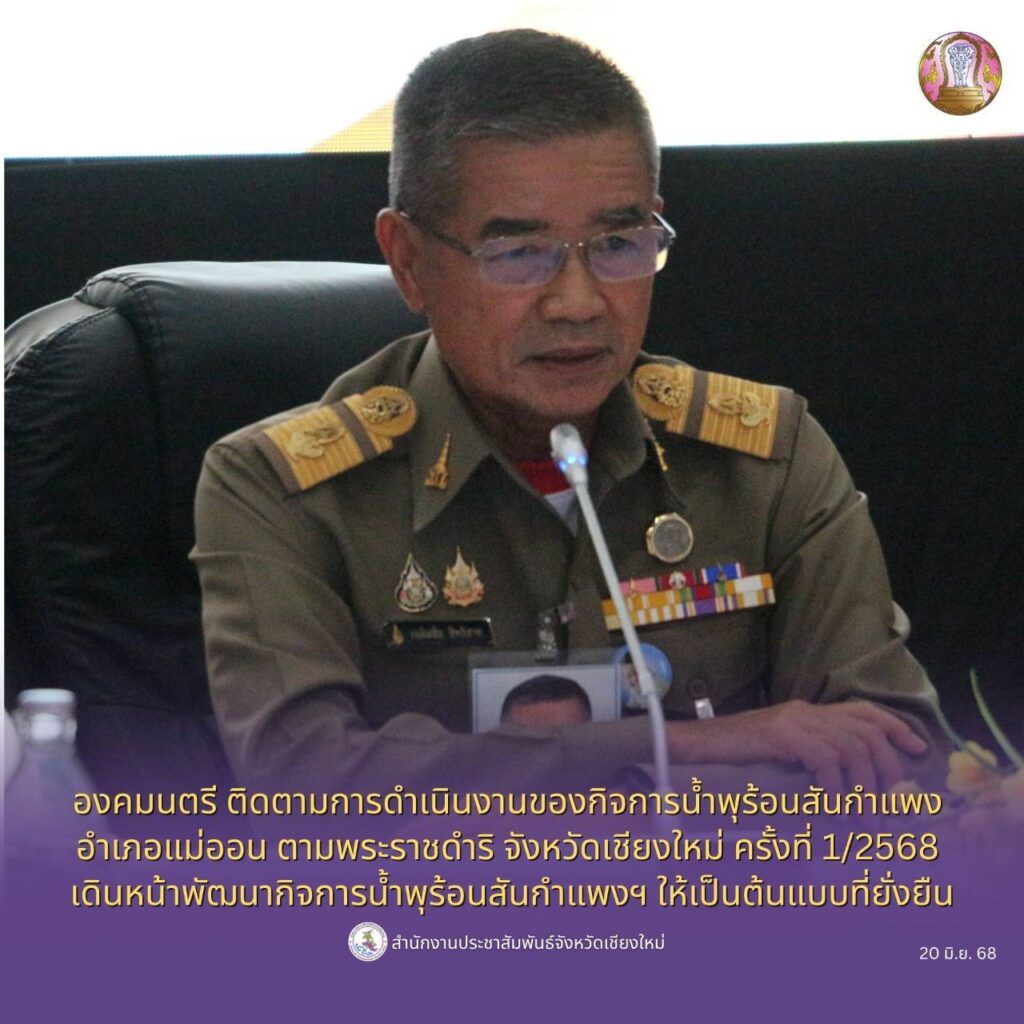 เชียงใหม่-องคมนตรี ติดตามการดำเนินงานของกิจการน้ำพุร้อนสันกำแพง อำเภอแม่ออน ตามพระราชดำริ จังหวัดเชียงใหม่ ครั้งที่ 1/2568 เดินหน้าพัฒนากิจการน้ำพุร้อนสันกำแพงฯ ให้เป็นต้นแบบที่ยั่งยืน