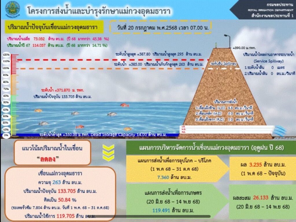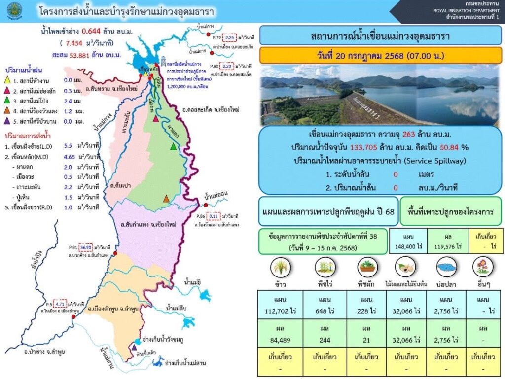 สำหรับสถานกการณ์น้ำในอ่างเก็บน้ำเขื่อนแม่กวงอุดมธารา นายเฉลิมเกียรติ อินทกนก ผคบ.แม่กวงฯ เปิดเผยว่า ปริมาณน้ำในเขื่อนแม่กวงฯ ยังอยู่ในเกณฑ์การบริหารจัดการน้ำในช่วงเวลาที่กำหนด (ช่วงเดือน ก.ค.) โดยให้มีปริมาณน้ำในอ่างไม่เกิน 193 ล้าน ลบ.ม. (ณ ปัจจุบัน ตาม URC) และ ณ วันที่ 1 พ.ย. ซึ่งสิ้นสุดฤดูฝนต้องไม่เกิน 250 ล้าน ลบ.ม.(95% ของความจุอ่างที่ 263 ล้าน ลบ.ม.) ขณะนี้ปริมาณน้ำในเขื่อนแม่กวงฯ มีปริมาณน้ำกักเก็บอยู่ที่ 133.705 ล้าน ลบ.ม. คิดเป็น 50.84% ของความจุ