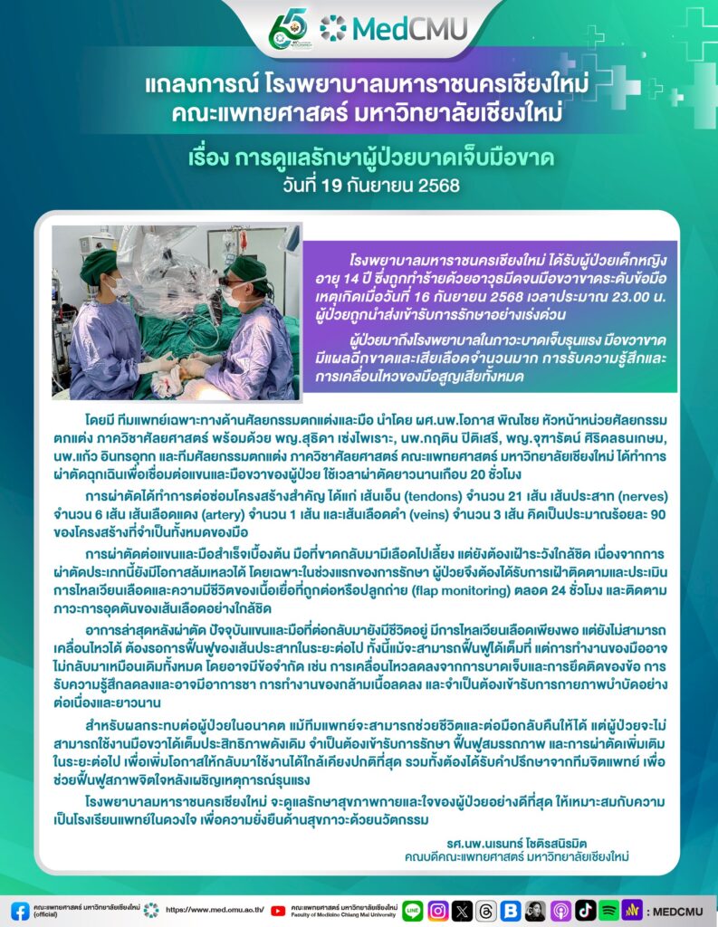 ล่าสุดรศ.นพ.นเรนทร์ โชติรสนิรมิต คณบดีคณะแพทยศาสตร์ มหาวิทยาลัยเชียงใหม่ และโรงพยาบาลมหาราชนครเชียงใหม่ ออกแถลงการว่าได้รับผู้ป่วยเด็กหญิงอายุ 14 ปี ซึ่งถูกทำร้ายด้วยอาวุธมีดจนมือขวาขาดระดับข้อมือ เหตุเกิดเมื่อวันที่ 16 กันยายน 2568 เวลาประมาณ 23.00 น. ผู้ป่วยถูกนำส่งเข้ารับการรักษาอย่างเร่งด่วน ผู้ป่วยมาถึงโรงพยาบาลในภาวะบาดเจ็บรุนแรง มือขวาขาด มีแผลฉีกขาดและเสียเลือดจำนวนมาก การรับความรู้สึกและการเคลื่อนไหวของมือสูญเสียทั้งหมด